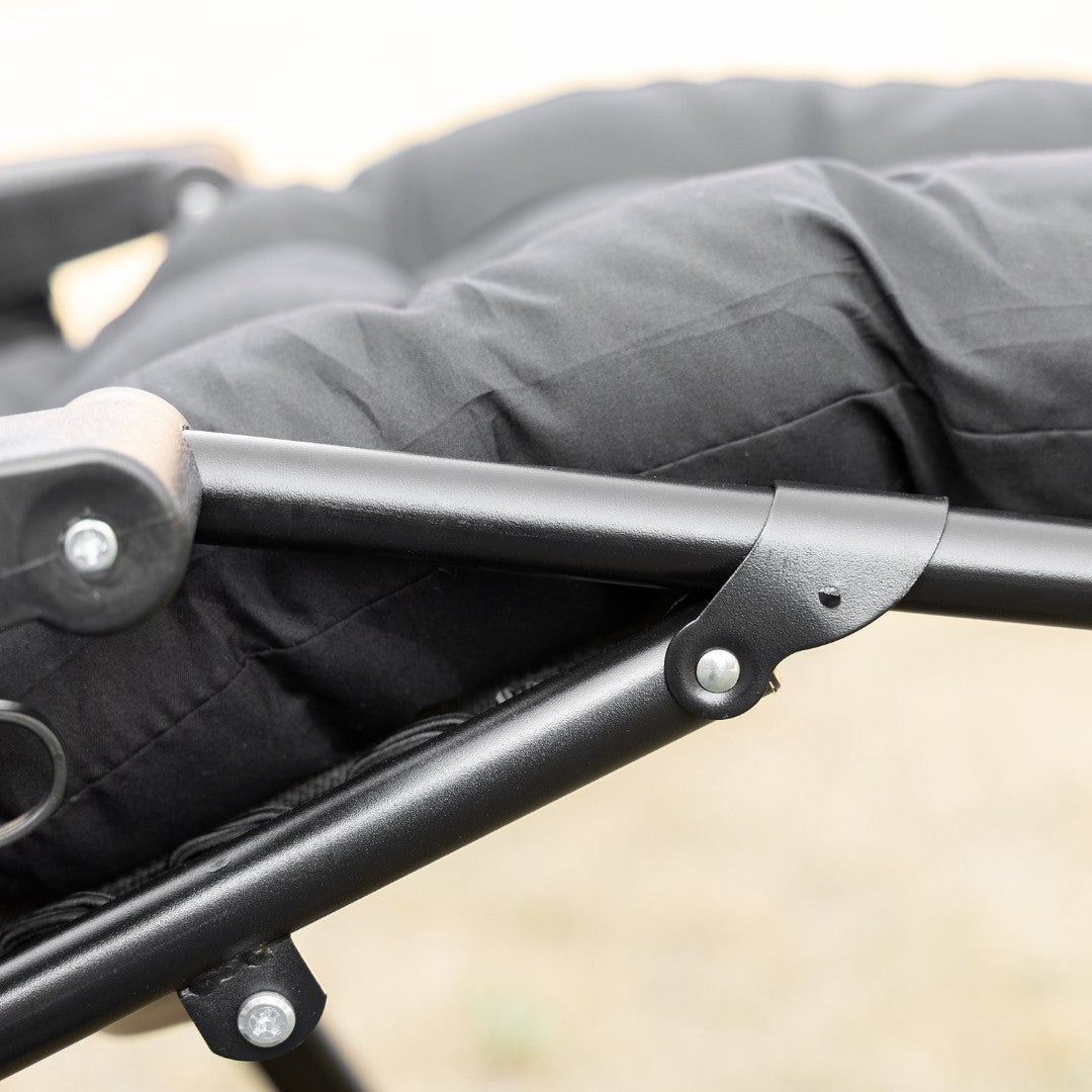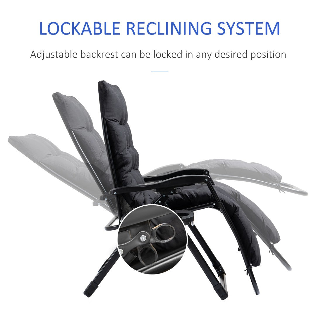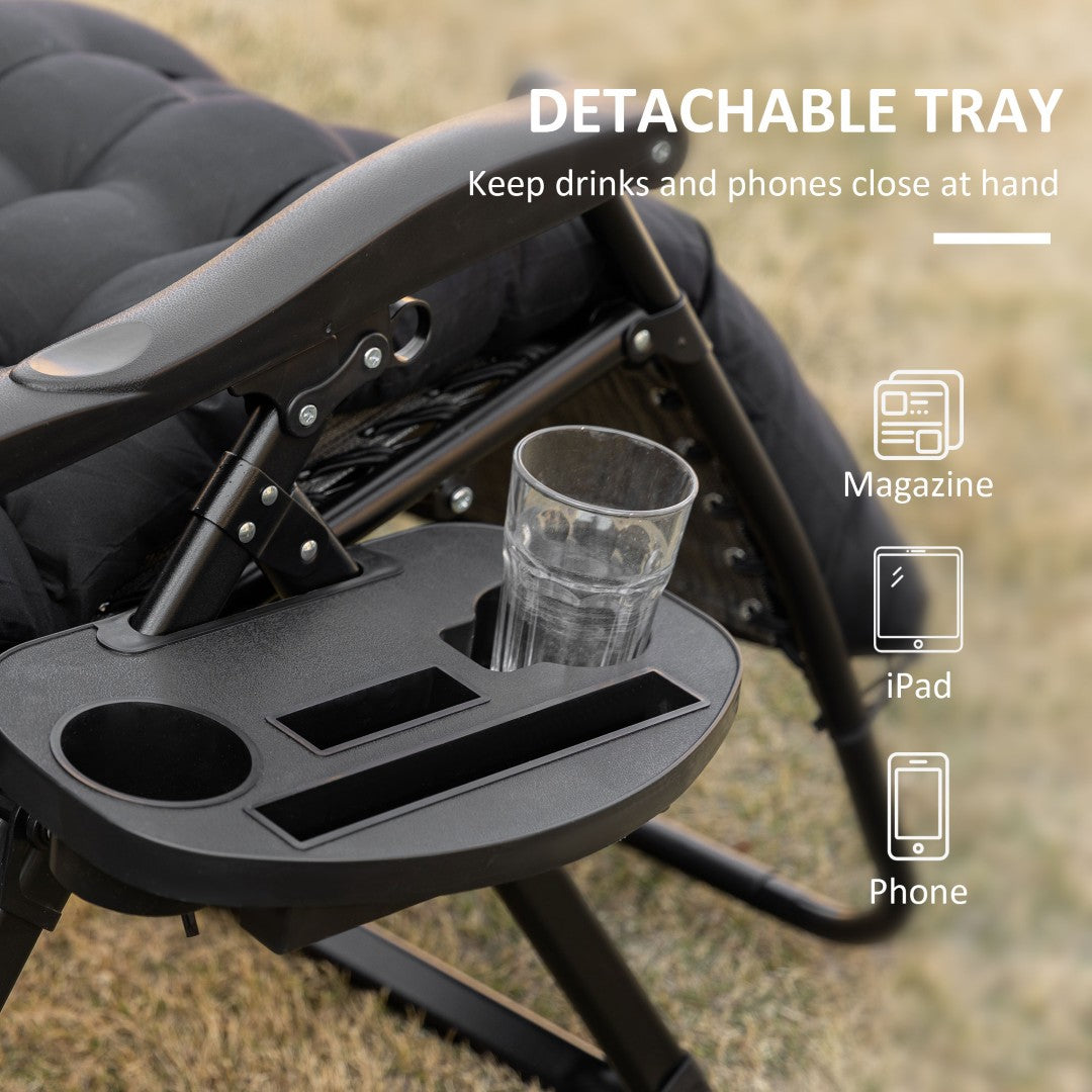 Relax in confidently engineered comfort with this versatile folding zero-gravity lounge chair. Designed for both indoor and outdoor use, it combines a supportive reclining frame, plush padded cushion, and a convenient side tray so you can recline, read, or sip without leaving your seat. The contemporary black finish and sturdy steel construction make it a practical, stylish addition to patios, balconies, sunrooms, or poolside seating.