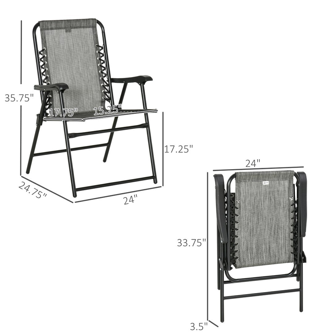 - Outdoor Folding Chair Set Info: Overall Dimensions: 24.75" L x 24" W x 35.75" H (Upright), 33.75"L x 24" W x 3.5" T (Folded). Weight Capacity: 264 lbs. (Each). No Assembly Required.