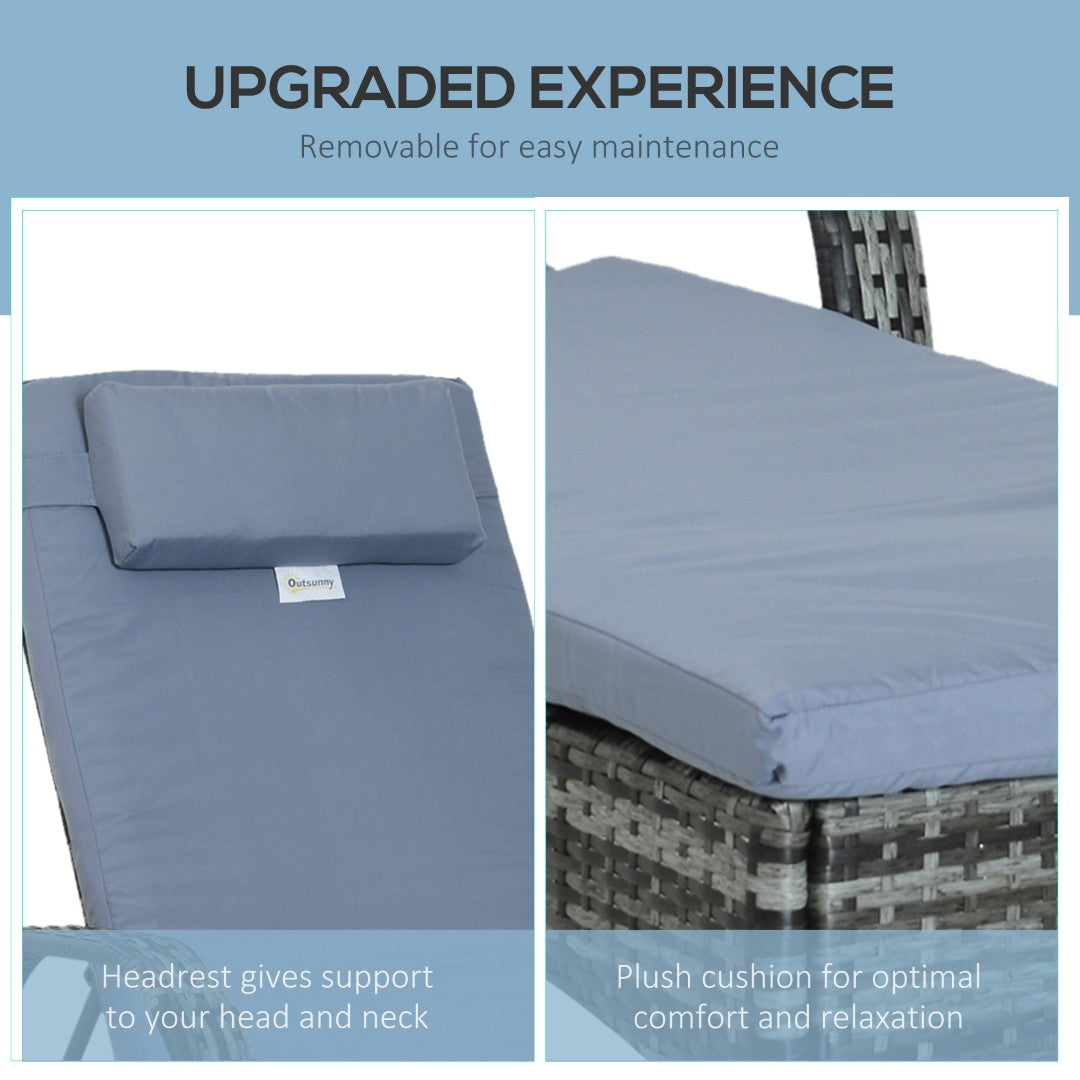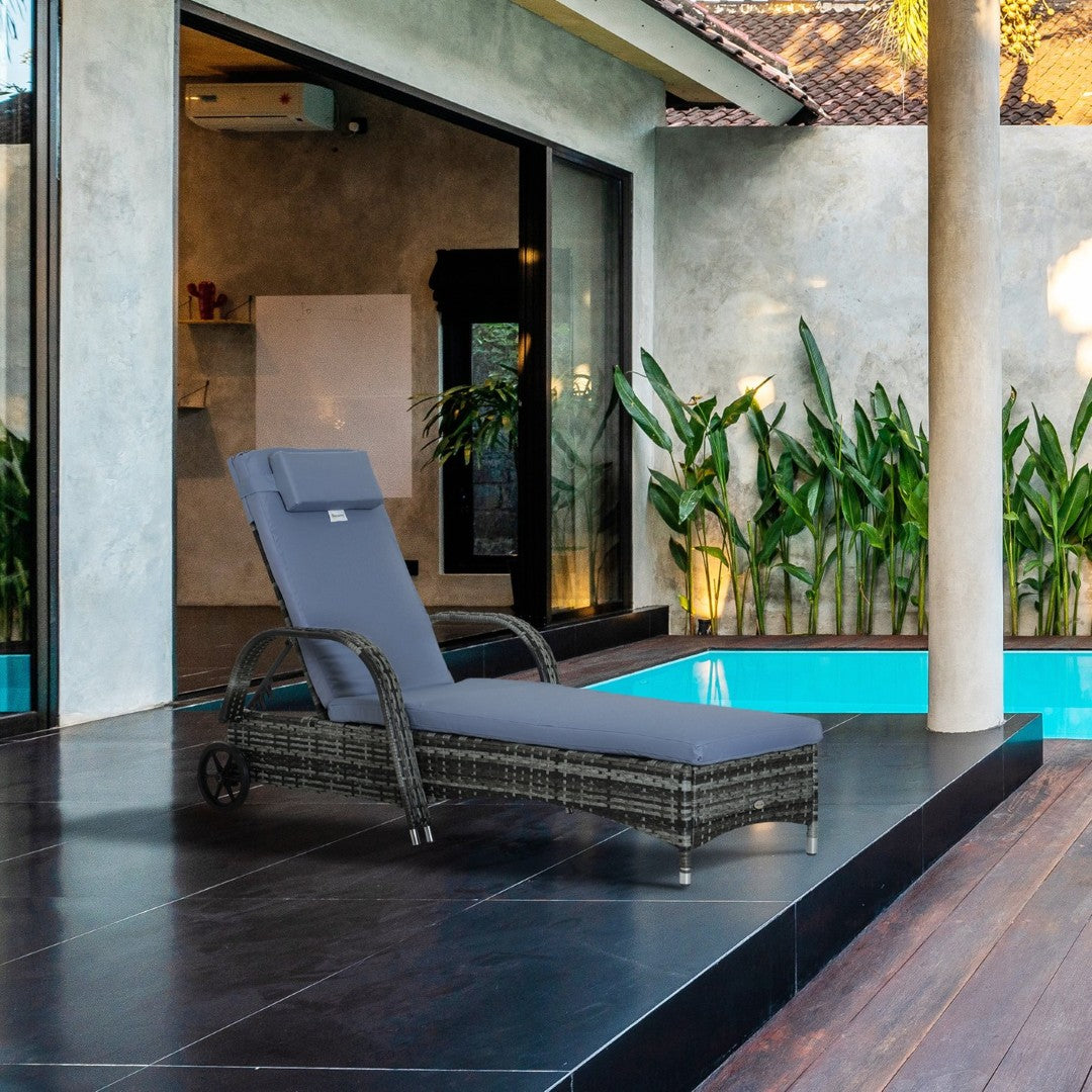 Relax in style with this Outsunny wicker chaise lounge—designed for poolside comfort, adjustable sunbathing, and durable outdoor use. Handwoven PE rattan over a powder-coated steel frame provides a weather-resistant, resort-style look, while the extra-thick cushion and removable headrest deliver lasting comfort for lounging, reading, or napping in the sun. Smooth-rolling wheels make repositioning effortless, and a five-level backrest gives you precise recline control from upright to fully flat.