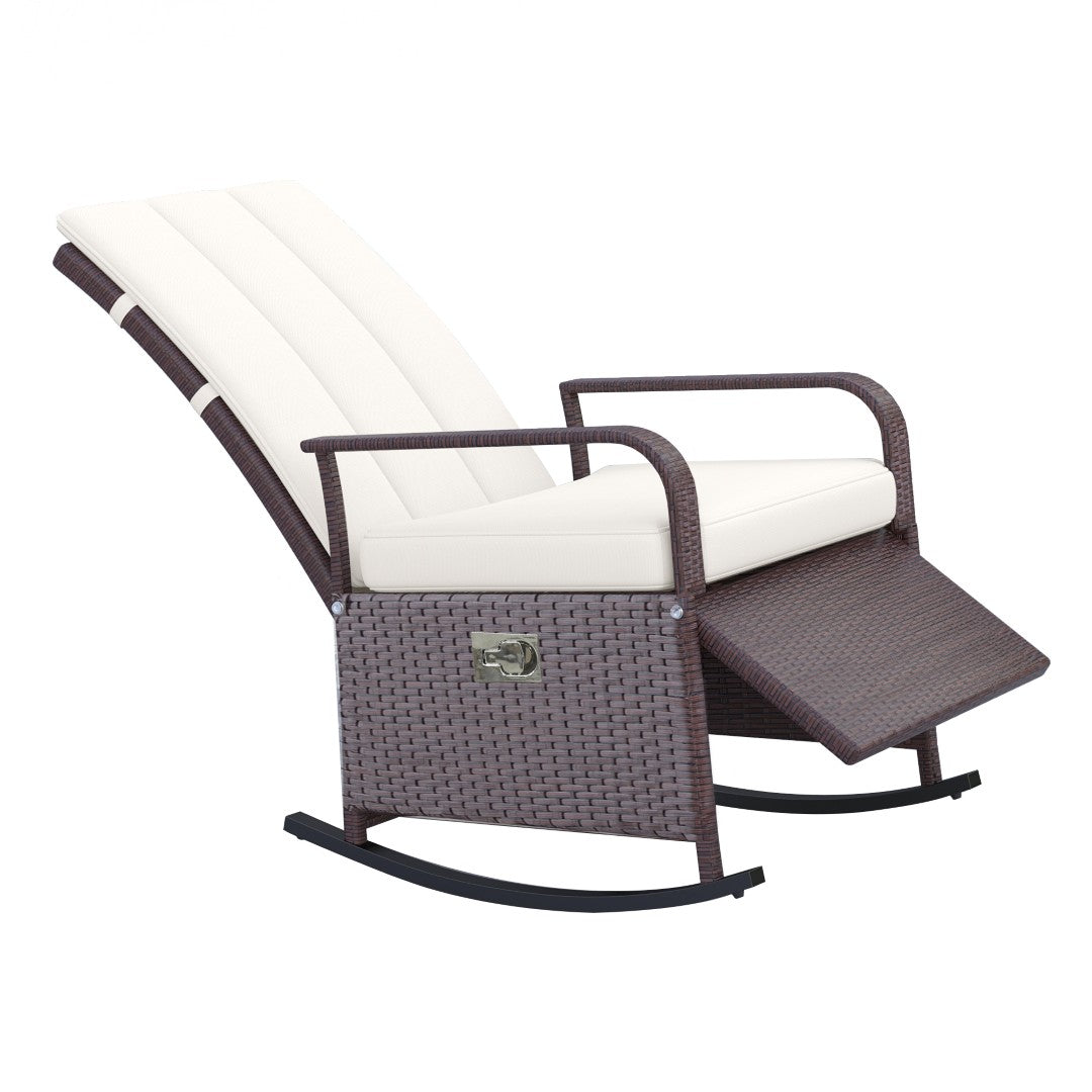 - Outdoor Rocking Rattan Recliner: A modern innovation of patio furniture, our outdoor rattan rocker is a recliner, too. Set the angle of the back and footrest to your liking. Sit, rock, lay, recline; this outdoor chair brings indoor-level comfort outside.