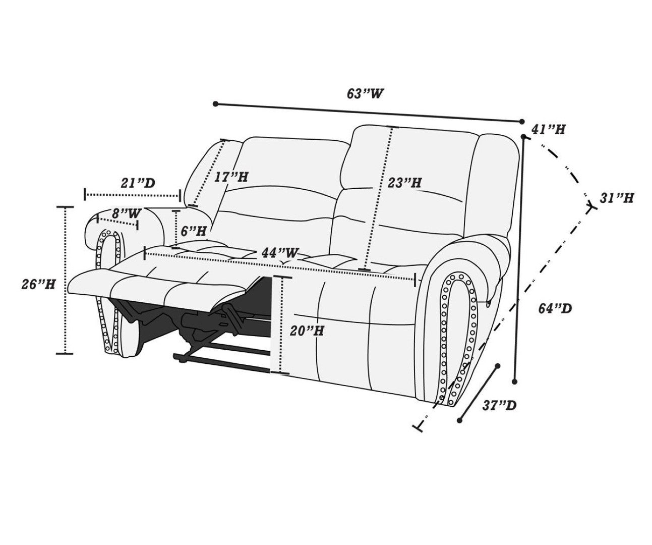 - Dimensions: Motion Loveseat: 63" L x 39" D x 37" H (also listed as 63" L x 31" W x 27" H — see assembly/spec sheet for exact measurement used in your configuration)