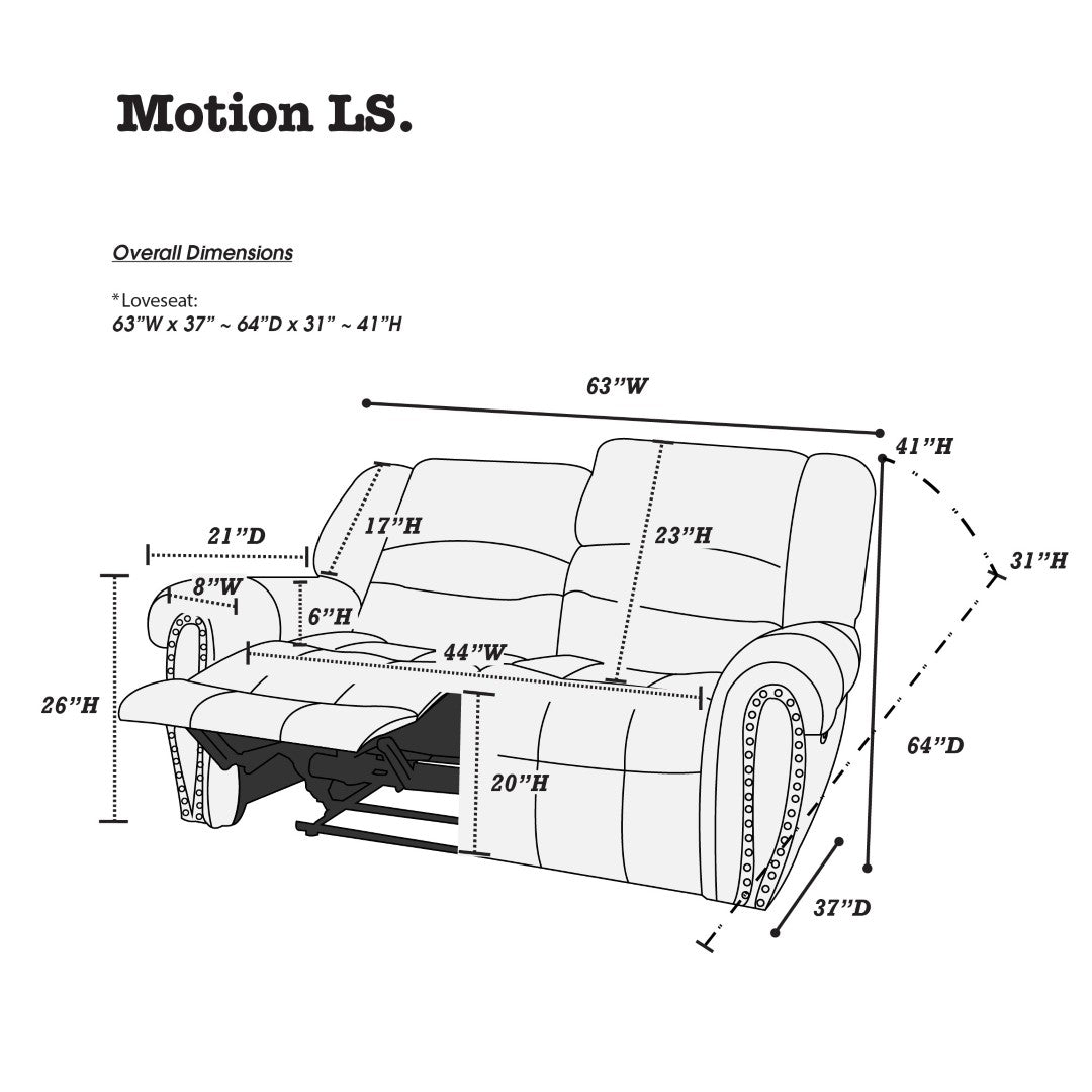 - Dimensions: Motion Loveseat: 63" L x 39" W x 37" H (also listed 63" L x 31" W x 27" H — primary manufacturer dimensions are 63" x 39" x 37" H)