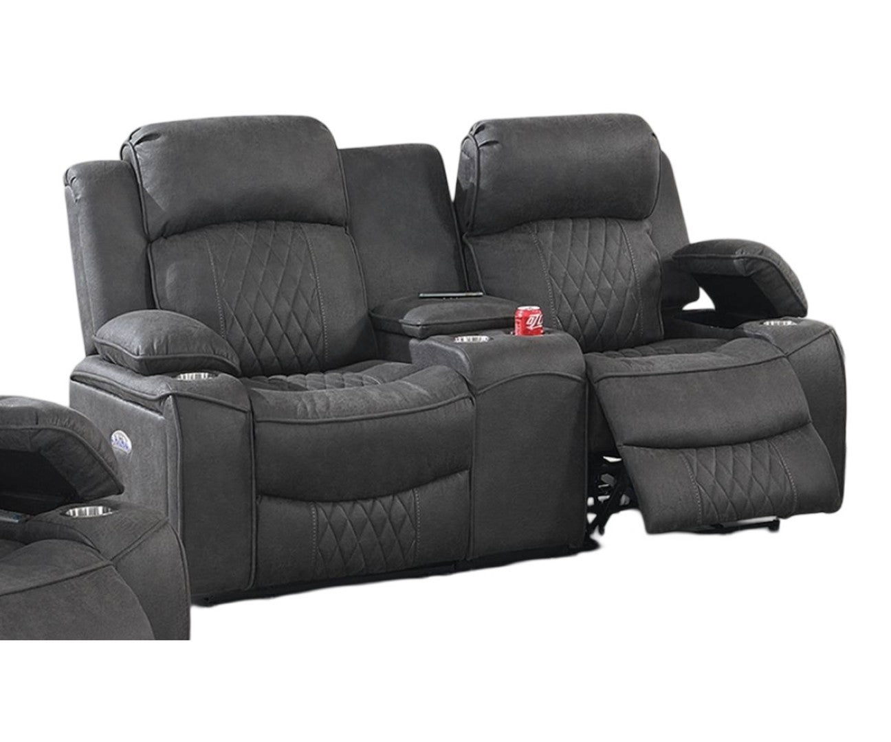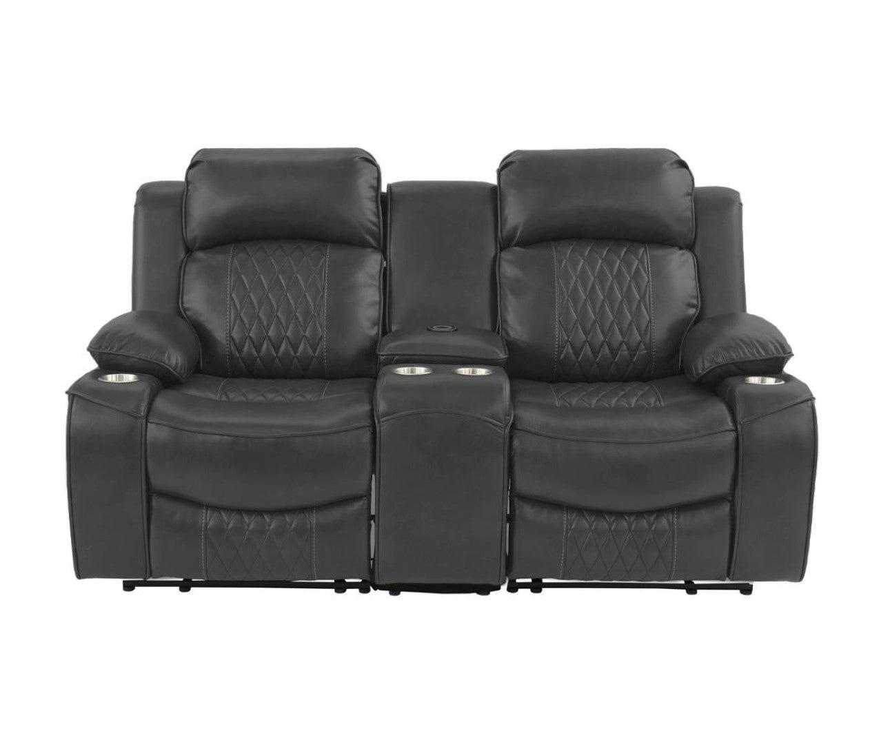 Transform your living space into a modern home-theater retreat with this power-motion loveseat. Plush, gel-infused leatherette cushions and fingertip-controlled reclining deliver lasting comfort, while integrated conveniences—like cup holders, USB charging, wireless charging, and overhead lighting—keep essentials within easy reach. Finished in contemporary charcoal, the loveseat blends refined style with everyday durability and easy-care performance.
