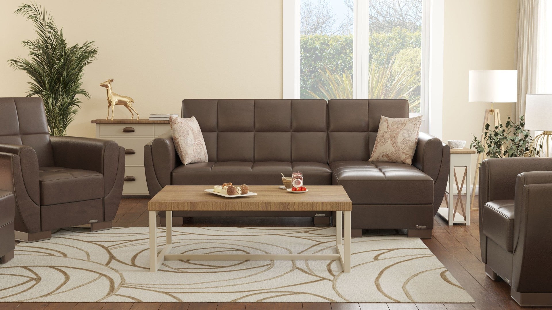 - Upholstery: Easy-care brown PU leather offers a modern aesthetic that’s simple to wipe clean and maintain.
