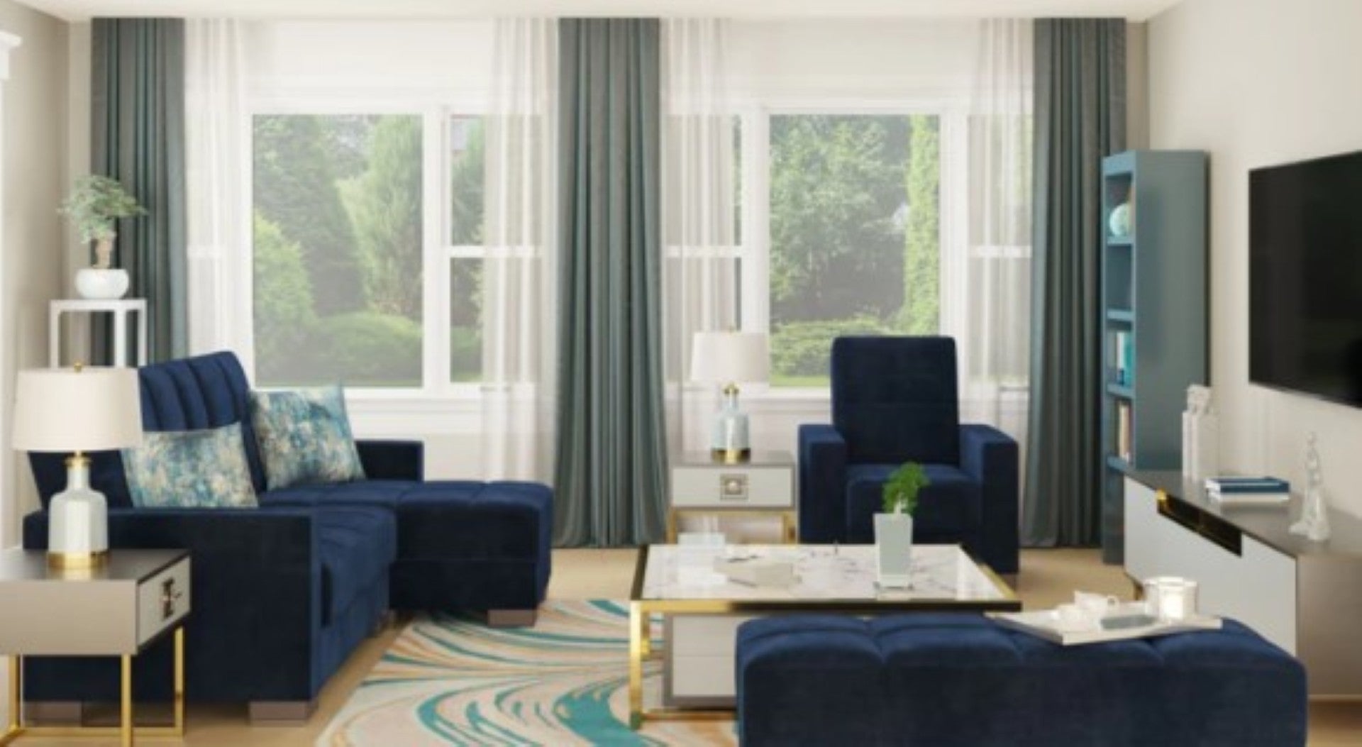 - Materials & Finish: Upholstered in soft blue chenille for a durable, easy-care surface; includes any pillows shown