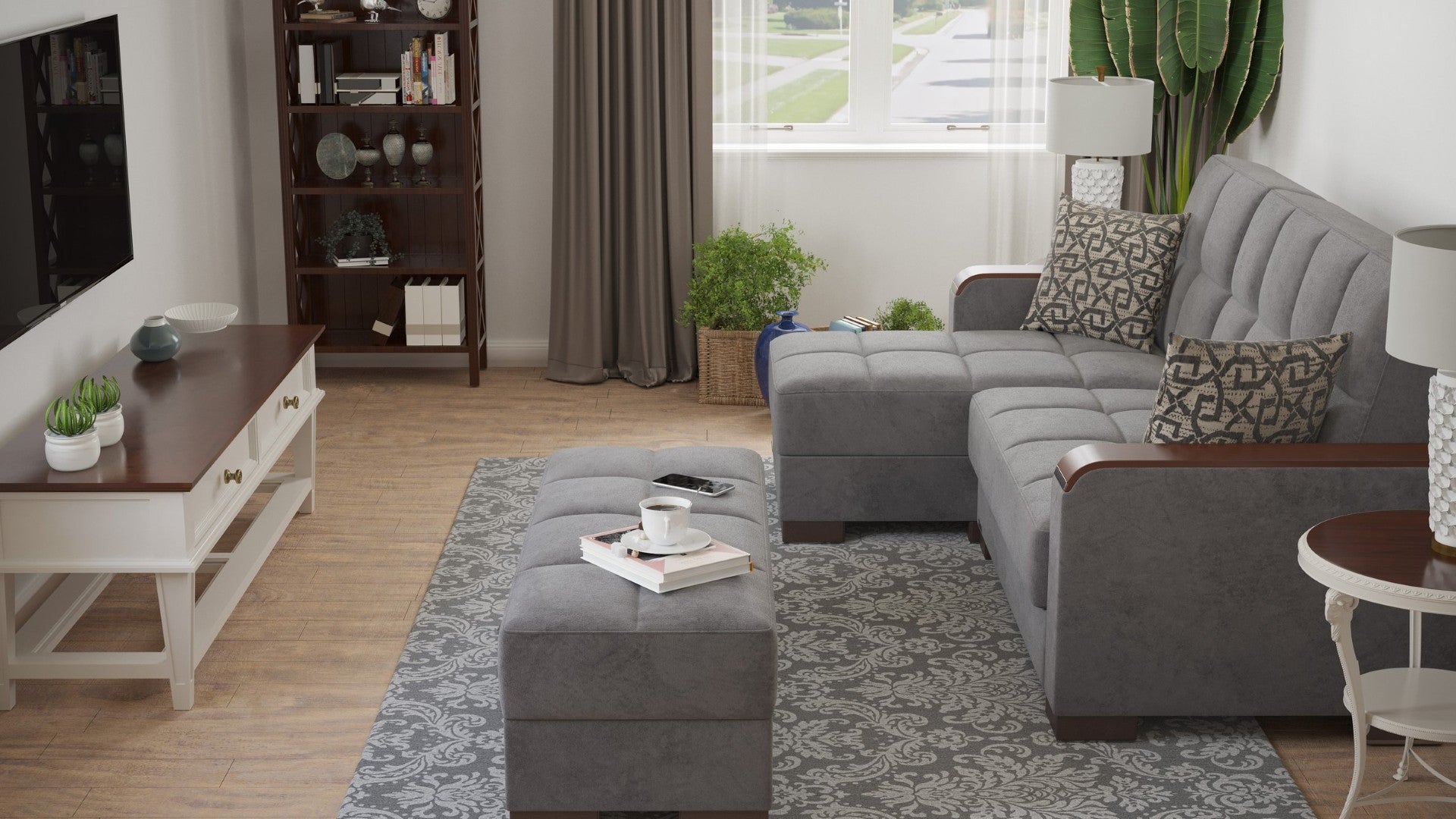 - Material & finish: Soft gray microfiber upholstery with wood-trim accents for a contemporary, easy-care look