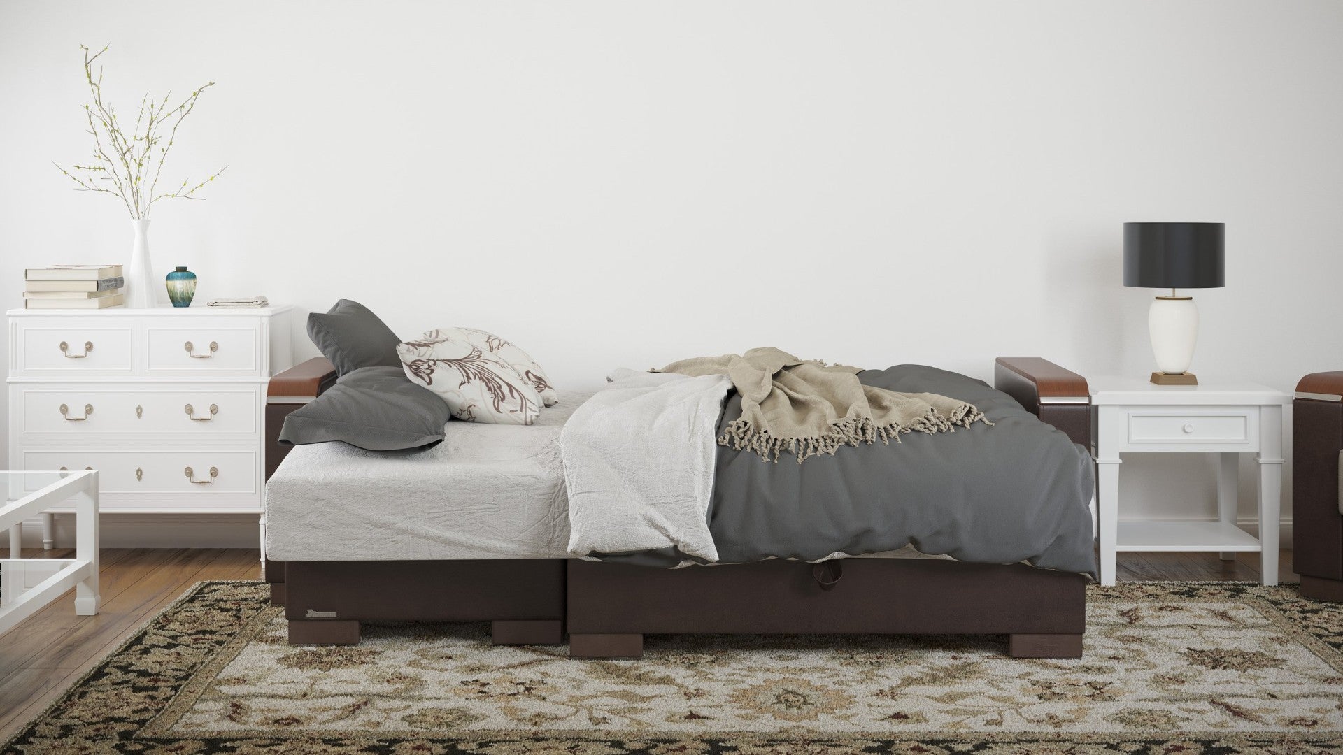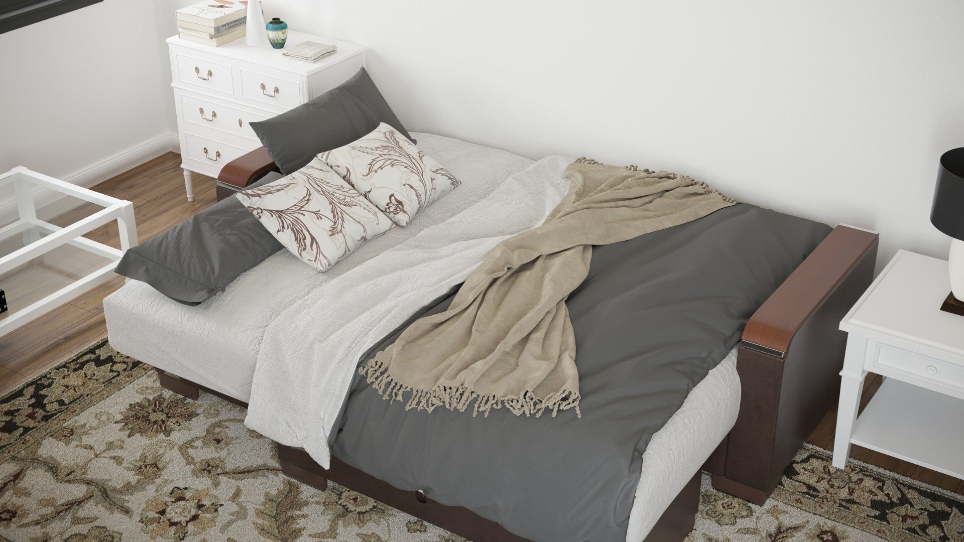 - Storage: Built-in storage compartment for bedding, pillows, or living-room essentials
