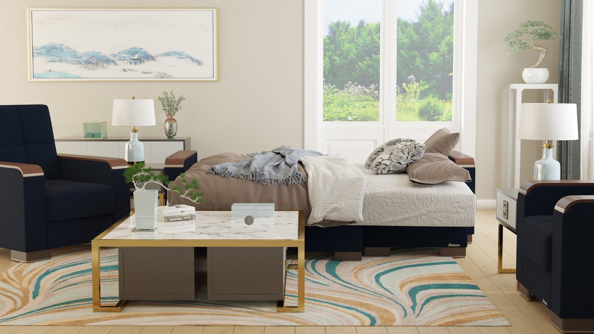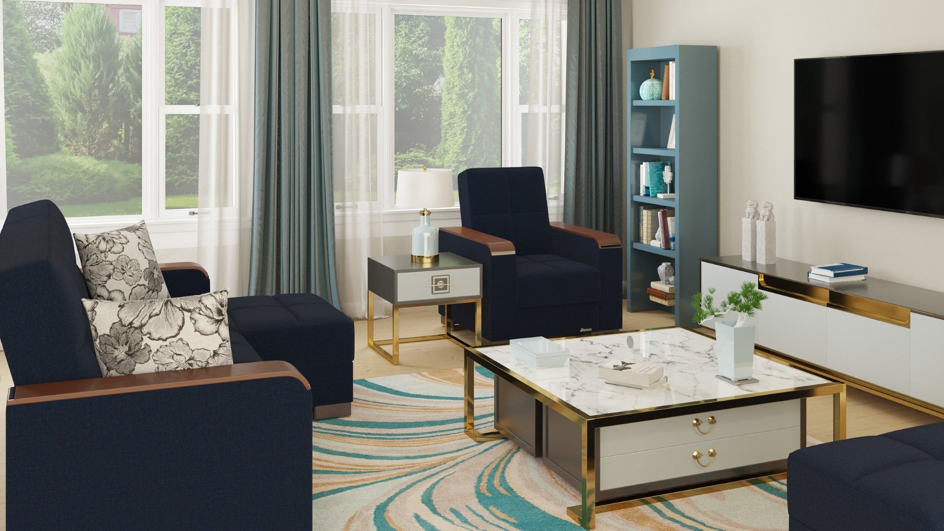 - Upholstery & Trim: Soft dark blue chenille fabric with refined wood trim for a modern, upscale look
