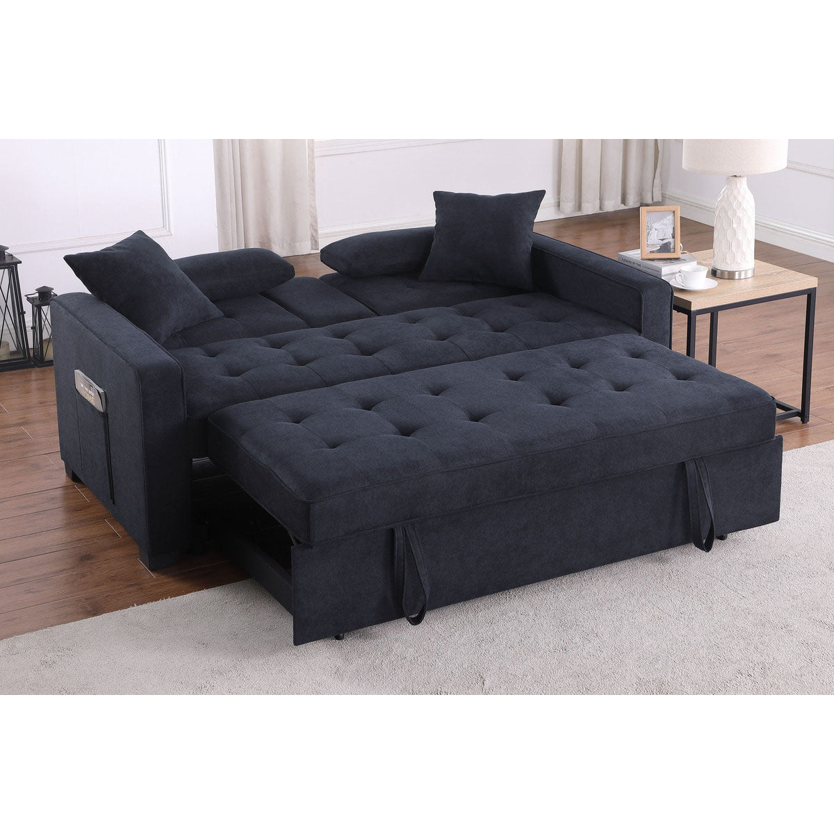 - Integrated Storage: Side storage pockets keep remotes, magazines, and small essentials organized and within reach.