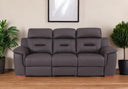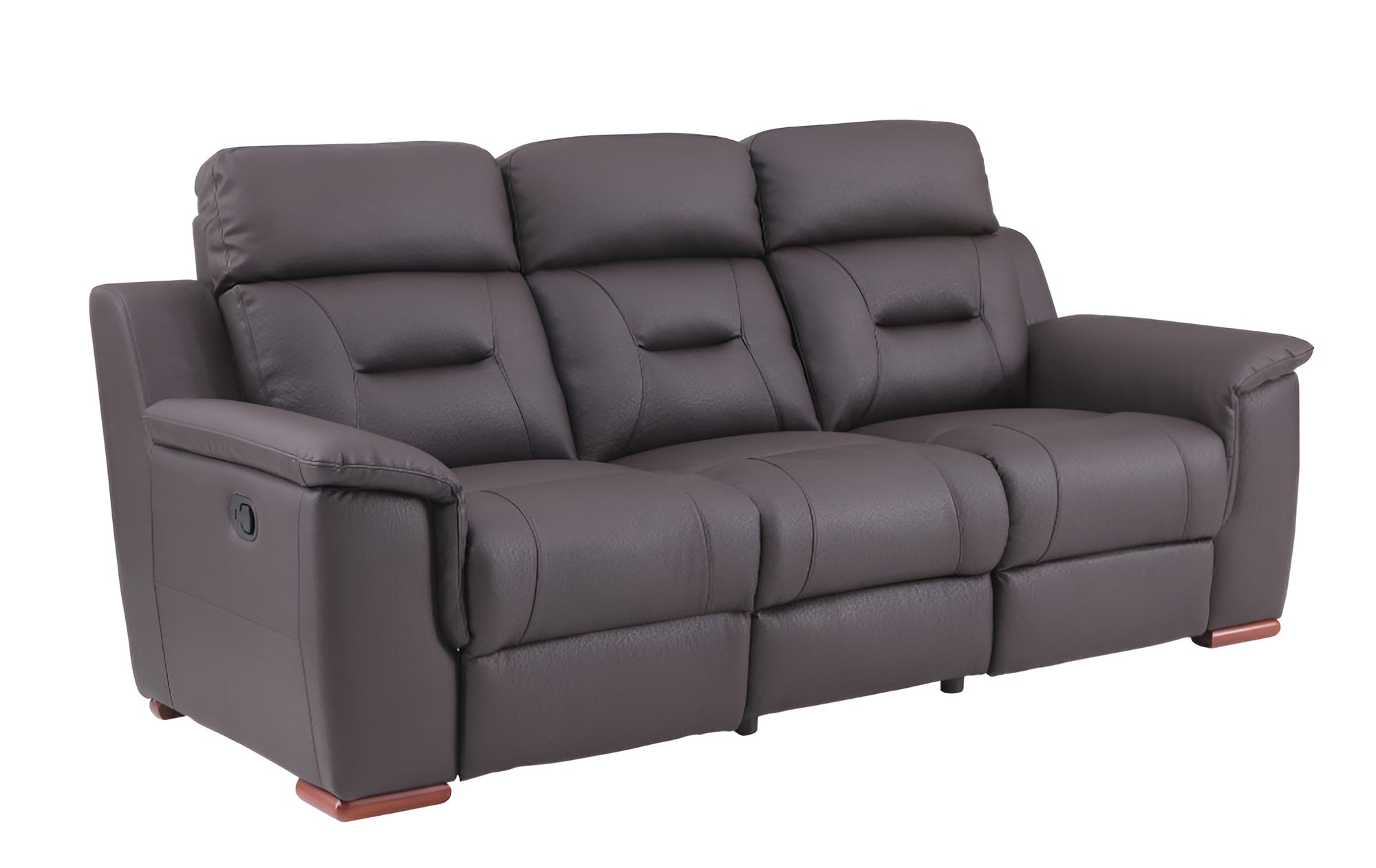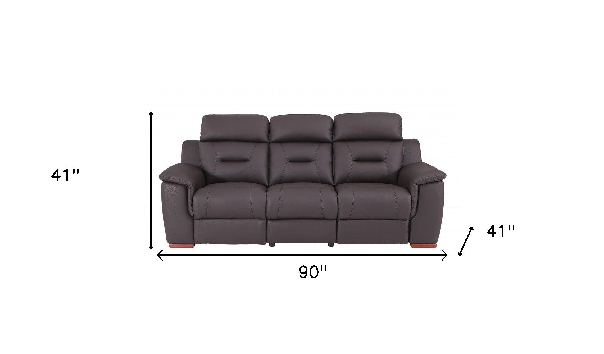 - Modern push-button reclining sofa in sleek brown upholstery.
