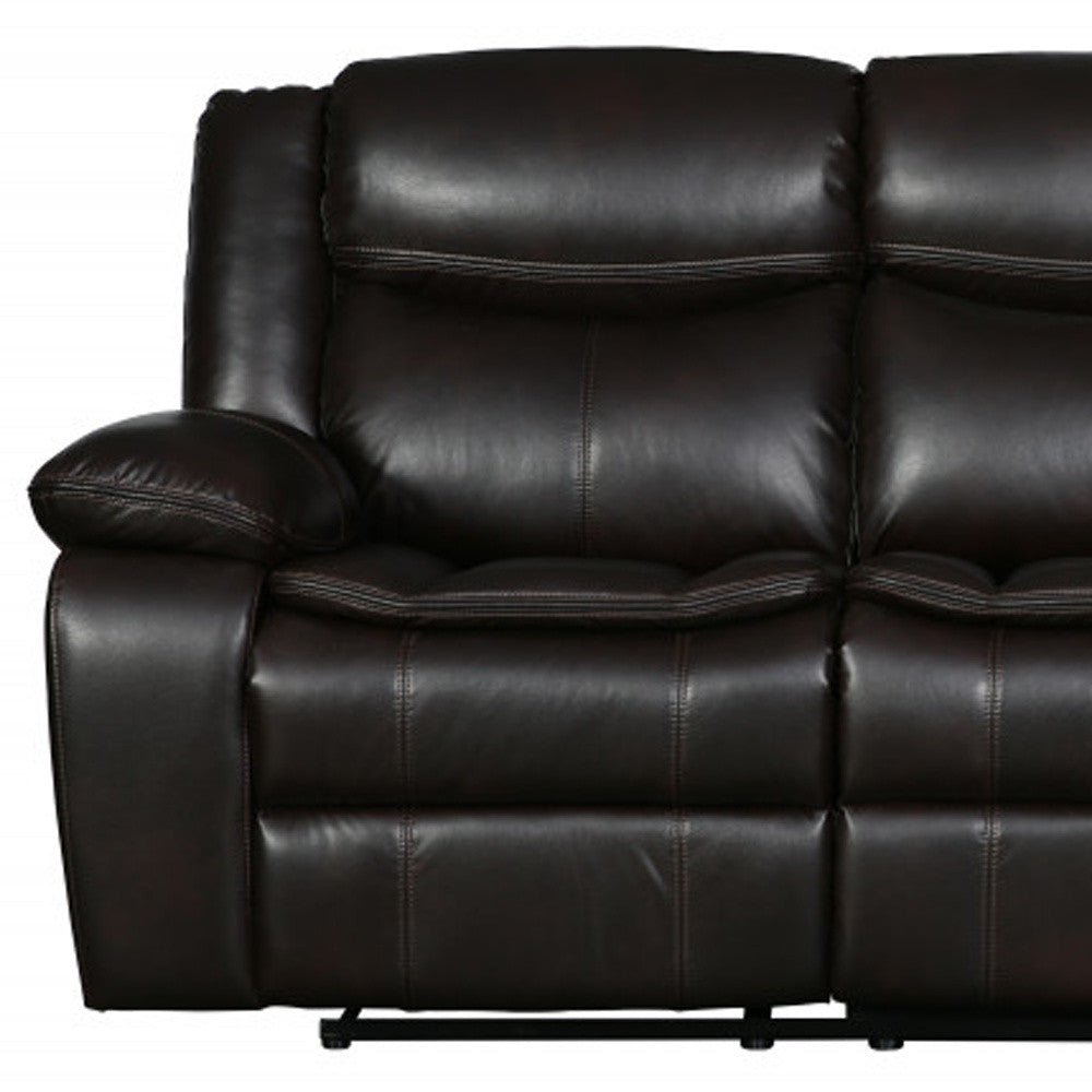- Manual reclining sofa in stylish brown upholstery.