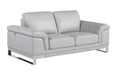 - Genuine leather upholstery in a light gray color.