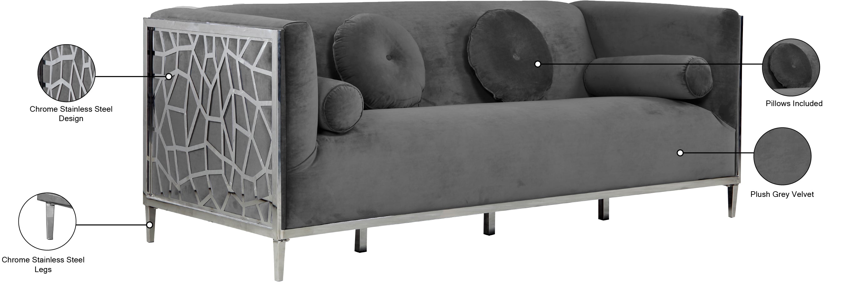 - Material: Velvet / Engineered Wood / Stainless Steel / Foam