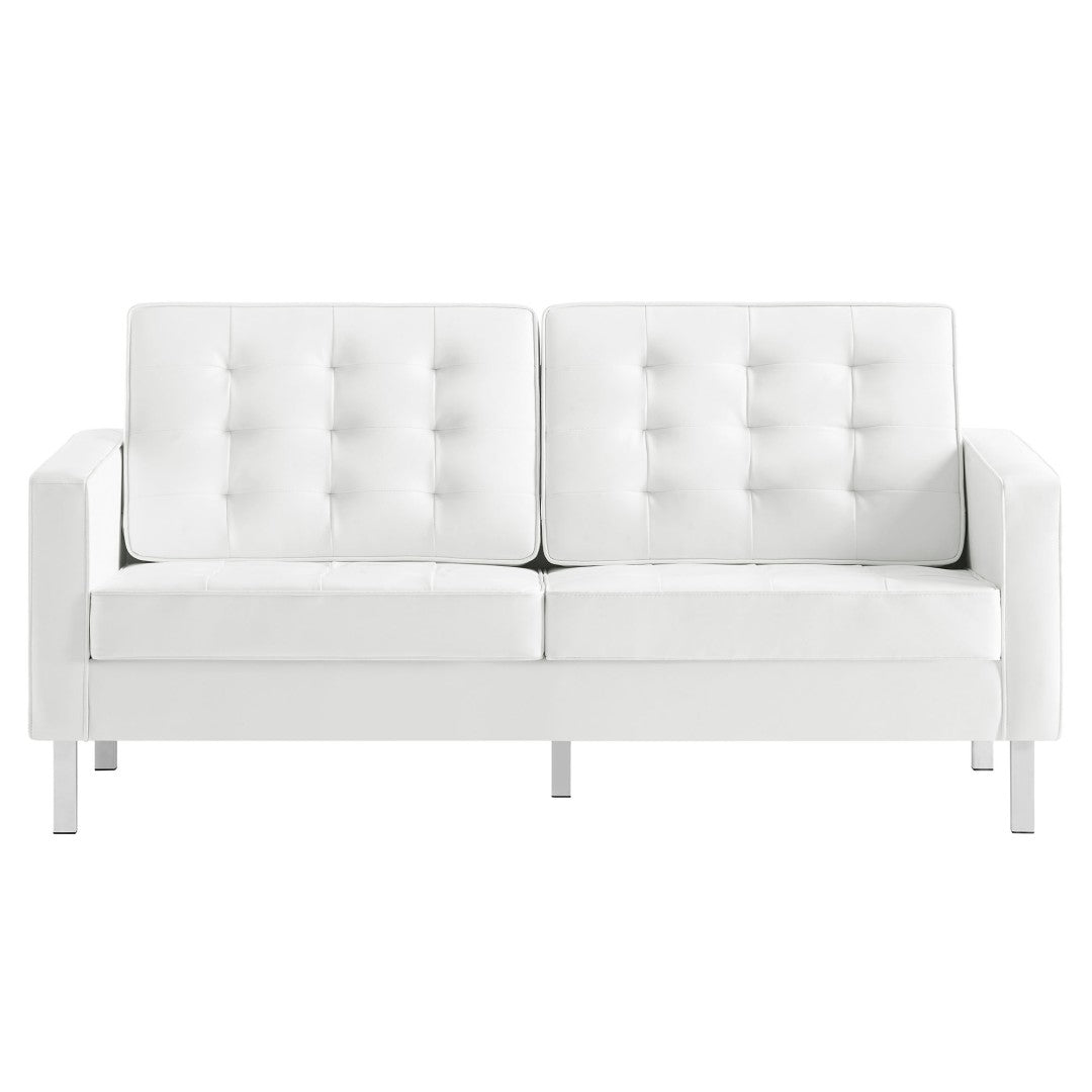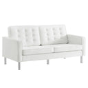 - Mid-Century Living Room Loveseat Vegan Leather Upholstery Biscuit Tufting Tubular Stainless Steel Legs Dense Foam Padding Non-Marking Foot Caps Weight Capacity: 660 lbs.