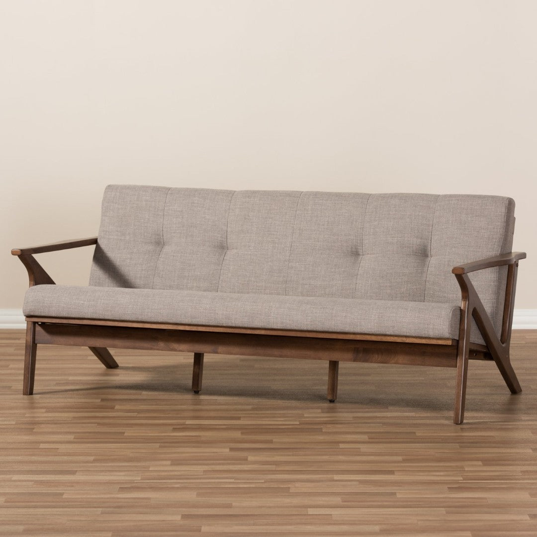 Invite timeless mid-century modern style and relaxed comfort into your living space with this Bianca 3-seater sofa. Thoughtfully designed with a tufted back, angular walnut-finish frame, and light grey polyester upholstery, it blends vintage-inspired lines with contemporary durability—ideal for living rooms, offices, or reception areas seeking a clean, warm aesthetic.