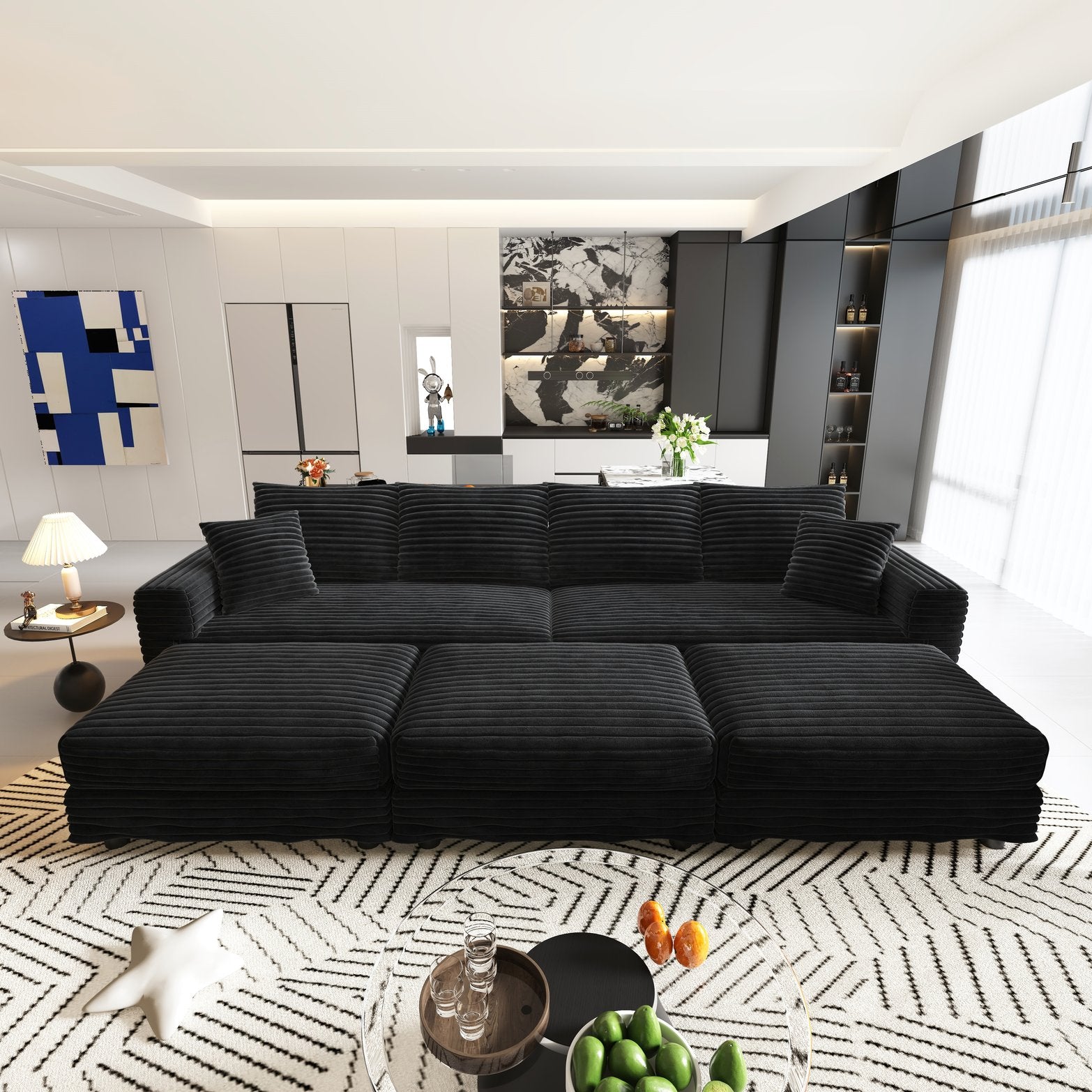 Experience cloud-like comfort and modern versatility with this plush corduroy 4-seat sofa. Thoughtfully engineered for everyday lounging and adaptable living spaces, it blends a soft, textured upholstery with a sturdy solid-wood frame and supportive spring-and-foam seating. Removable backrests, a configurable set of three ottomans, and included pillows make it ideal for family rooms, open-plan lofts, or cozy media corners — offering restful relaxation, reliable durability (up to 1000 lb capacity), and easy assembly.