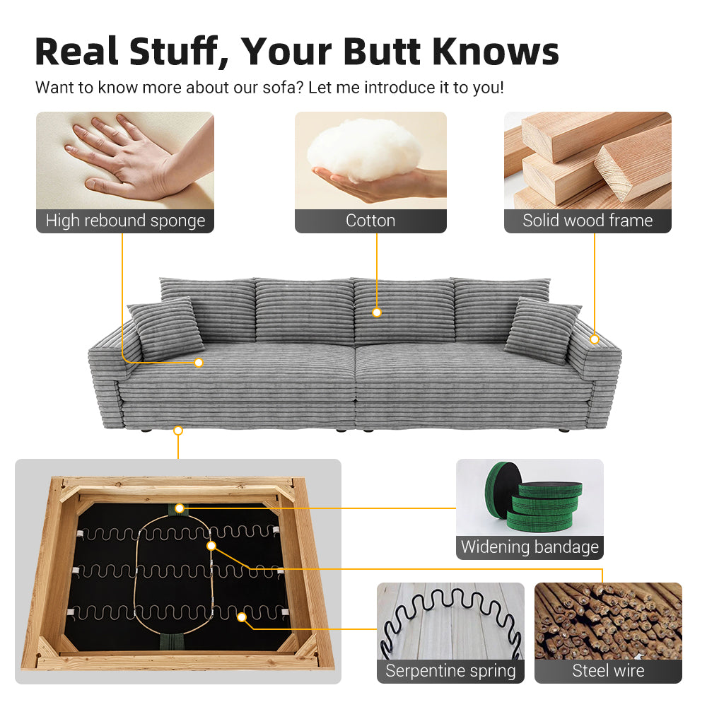 Sink into cloud-like comfort with this plush corduroy 4-seat sofa—designed for modern living rooms, apartments, and office lounges. Expertly crafted with a solid wood frame, sinuous spring seating, high-density foam, and soft cotton fill, this convertible sofa offers deep seats, supportive back pillows, and versatile ottomans that transform your layout from a classic couch to a segmented or U-shaped lounge. Soft-to-the-touch corduroy upholstery, sturdy construction rated to support up to 1000 lb, and quick assembly make it an attractive, practical centerpiece for everyday relaxation and entertaining.