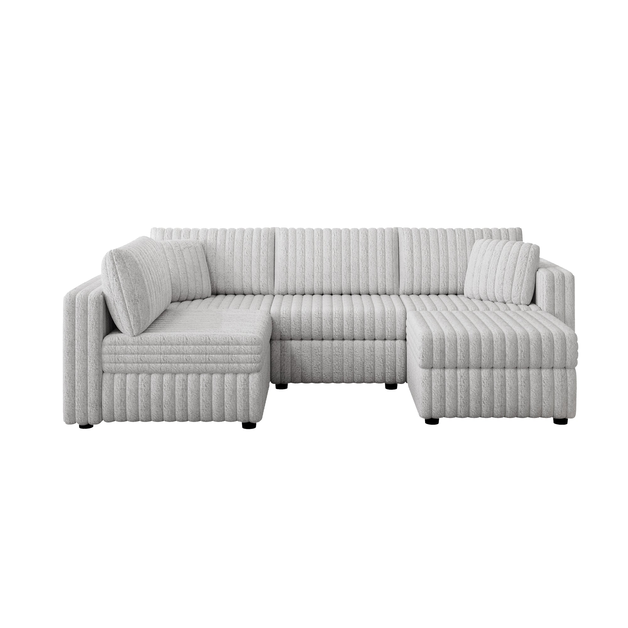 Enjoy spacious, modern comfort with this soft U-shaped modular sofa designed to seat four and coordinate seamlessly with its matching ottoman. Upholstered in light gray fabric with included throw pillows, the sofa combines contemporary styling with thoughtful storage solutions—perfect for living rooms, family rooms, or bedrooms where both form and function matter.