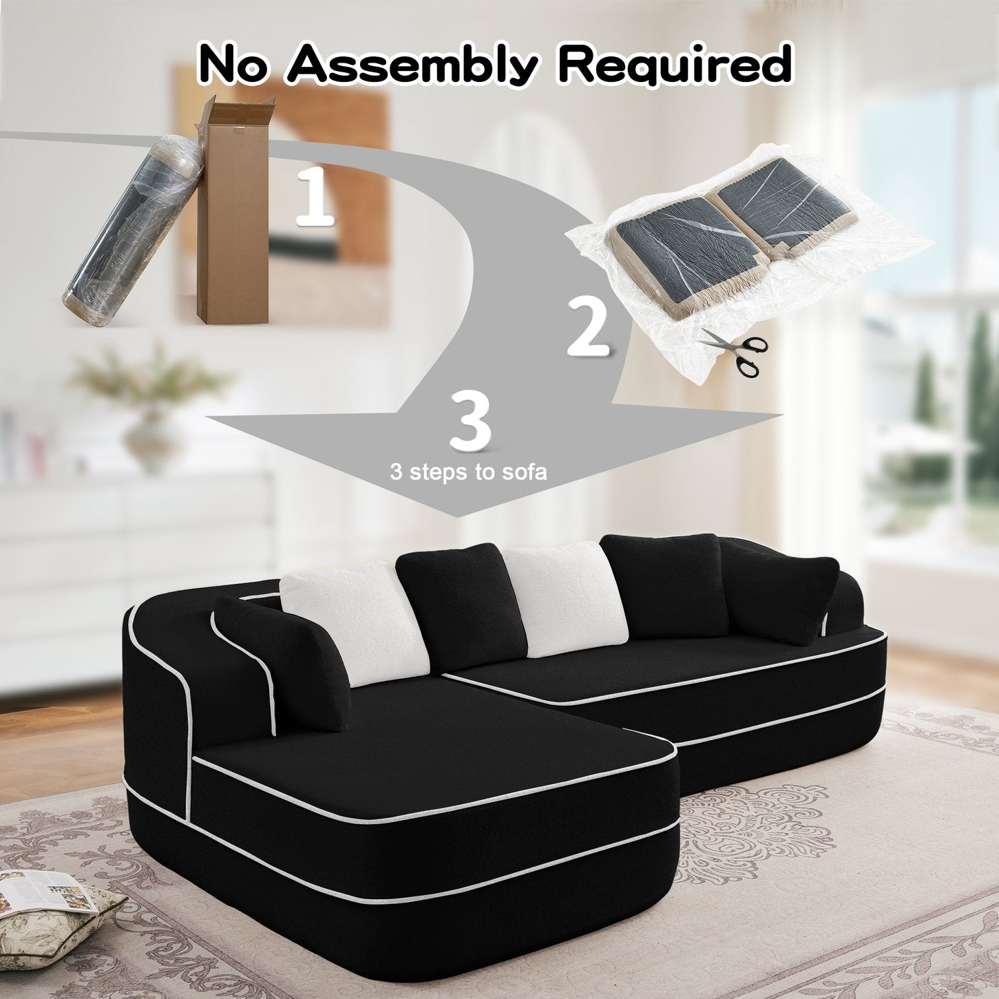 - No Assembly Required: Our modular sofa eliminates the hassle of complicated furniture setup – it's ready to arrange right out of the box. Simply unpack all components and gently pat each module to activate its elasticity, restoring its beautiful shape.
