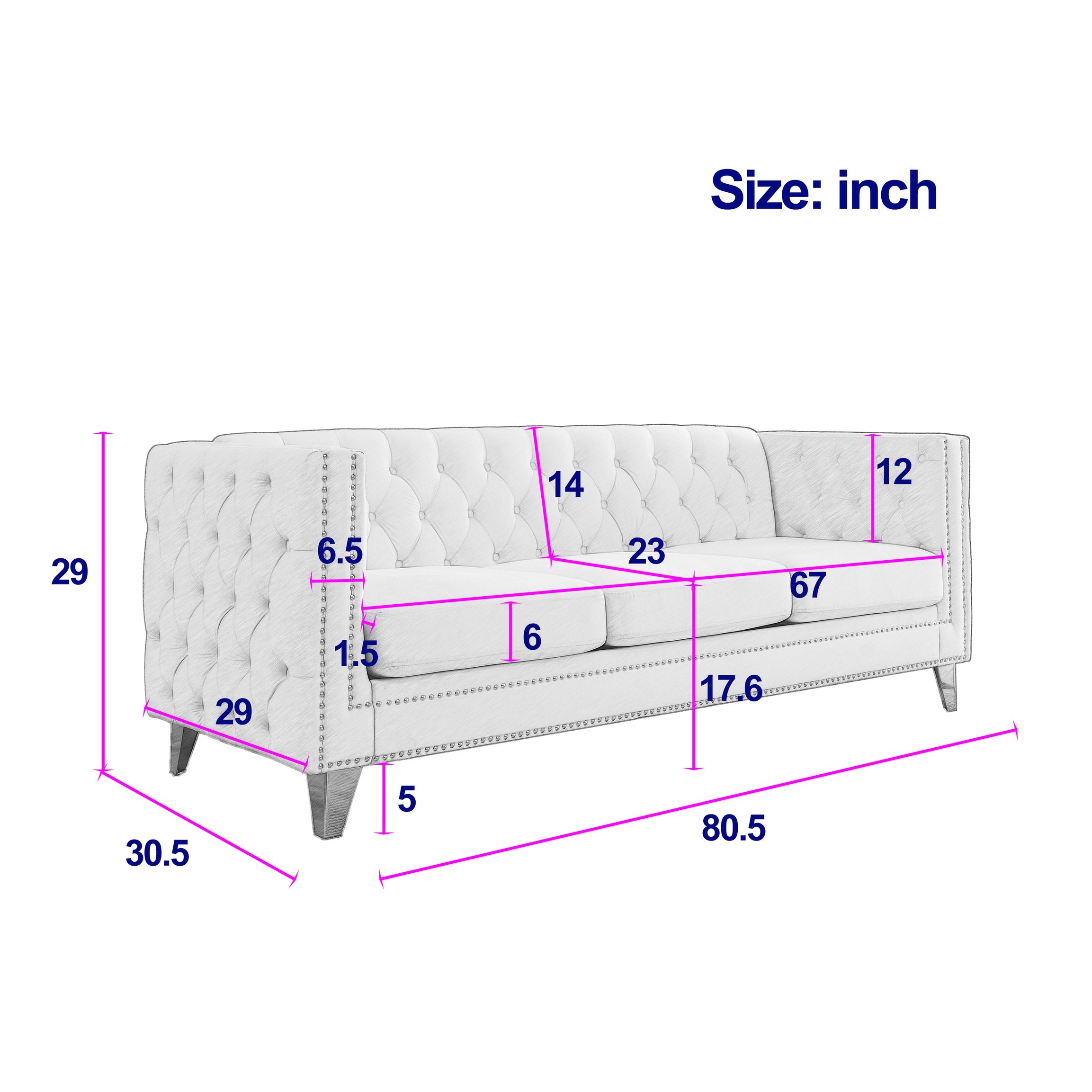 - Materials: Velvet upholstery; cotton inner upholstery; frame constructed from pine, eucalyptus, and plywood; metal sofa feet