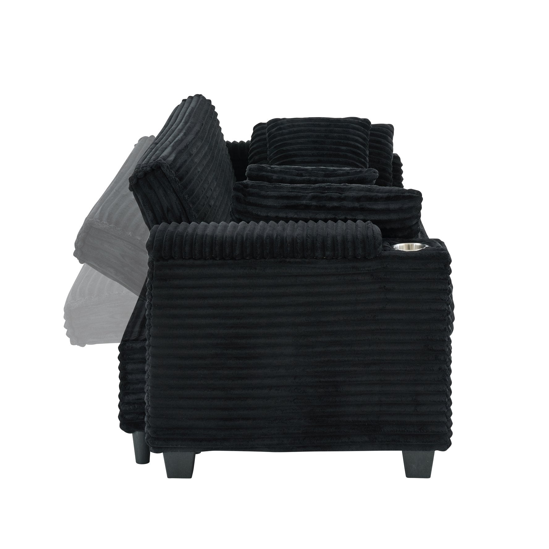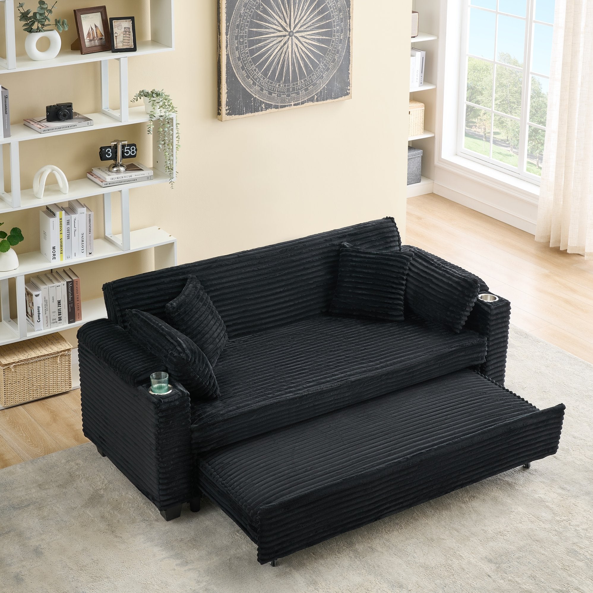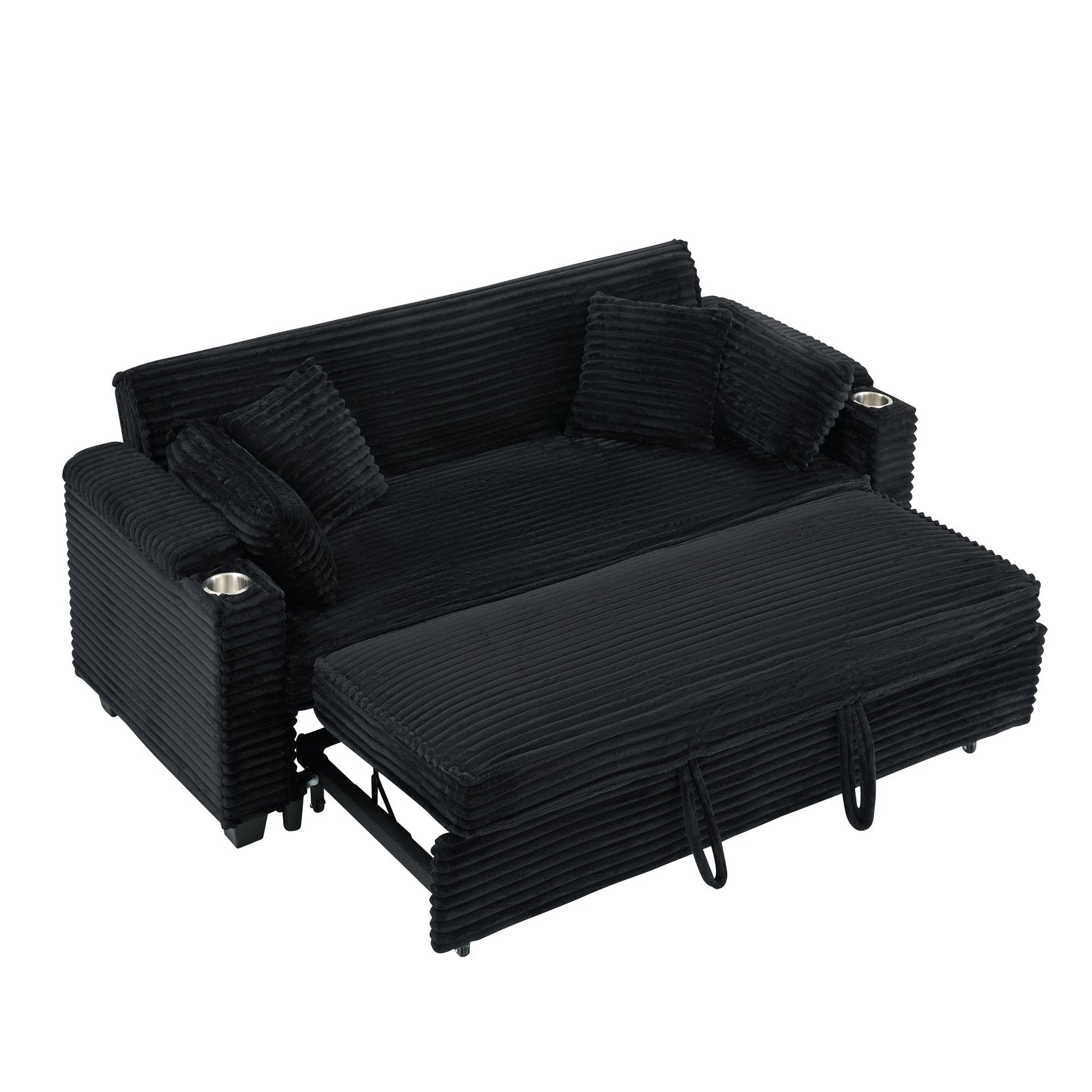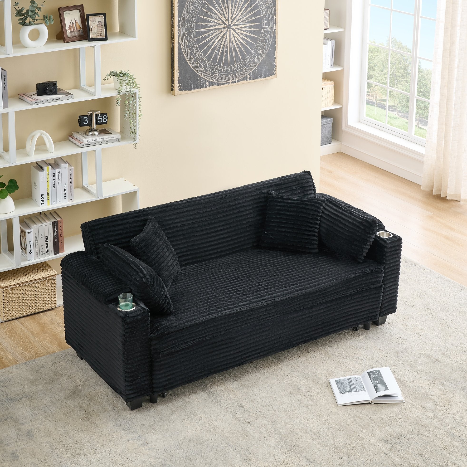 This versatile black corduroy sofa bed combines modern style with practical multifunctionality, making it an ideal centerpiece for living rooms, apartments, or bedrooms. Plush corduroy upholstery and sponge-filled cushions provide comfortable seating for up to three people and convert easily into a spacious sleeping surface. Solid wood construction and a wood-based panel seat with spring cushioning ensure reliable support, while built-in cup holders and included pillows add everyday convenience. The design balances compact footprint and extended comfort for small-space living without sacrificing durability or aesthetics.