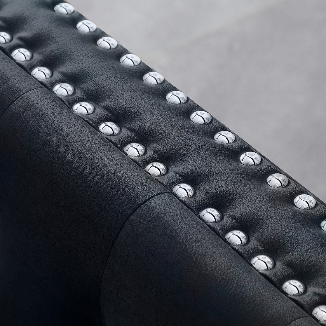 - Trim & Accents: Silver nailhead trim outlines the arms and base, complementing the jeweled tufting