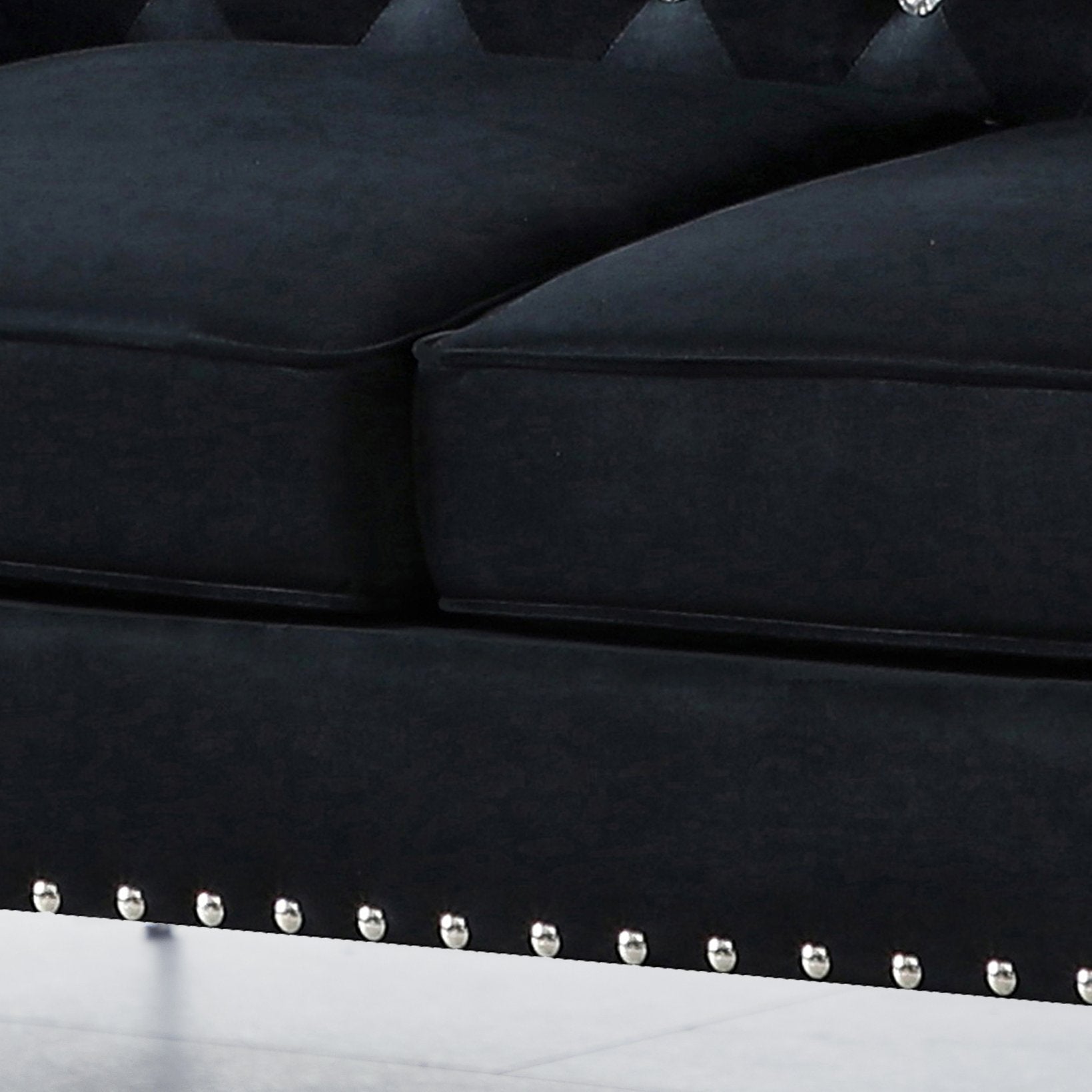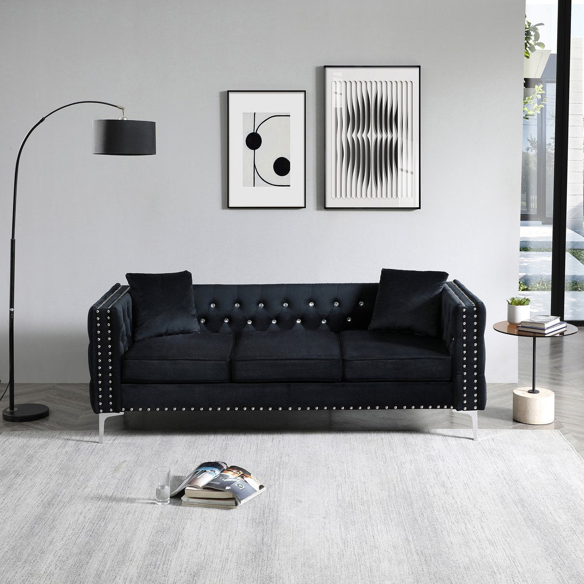 Enjoy modern glamour and everyday comfort with this spacious velvet sofa, featuring sophisticated tufting and jeweled button accents. Designed for style and durability, it blends plush seating with polished metallic details to elevate living rooms, lounges, or large entertaining spaces. Includes two matching throw pillows for a coordinated look.
