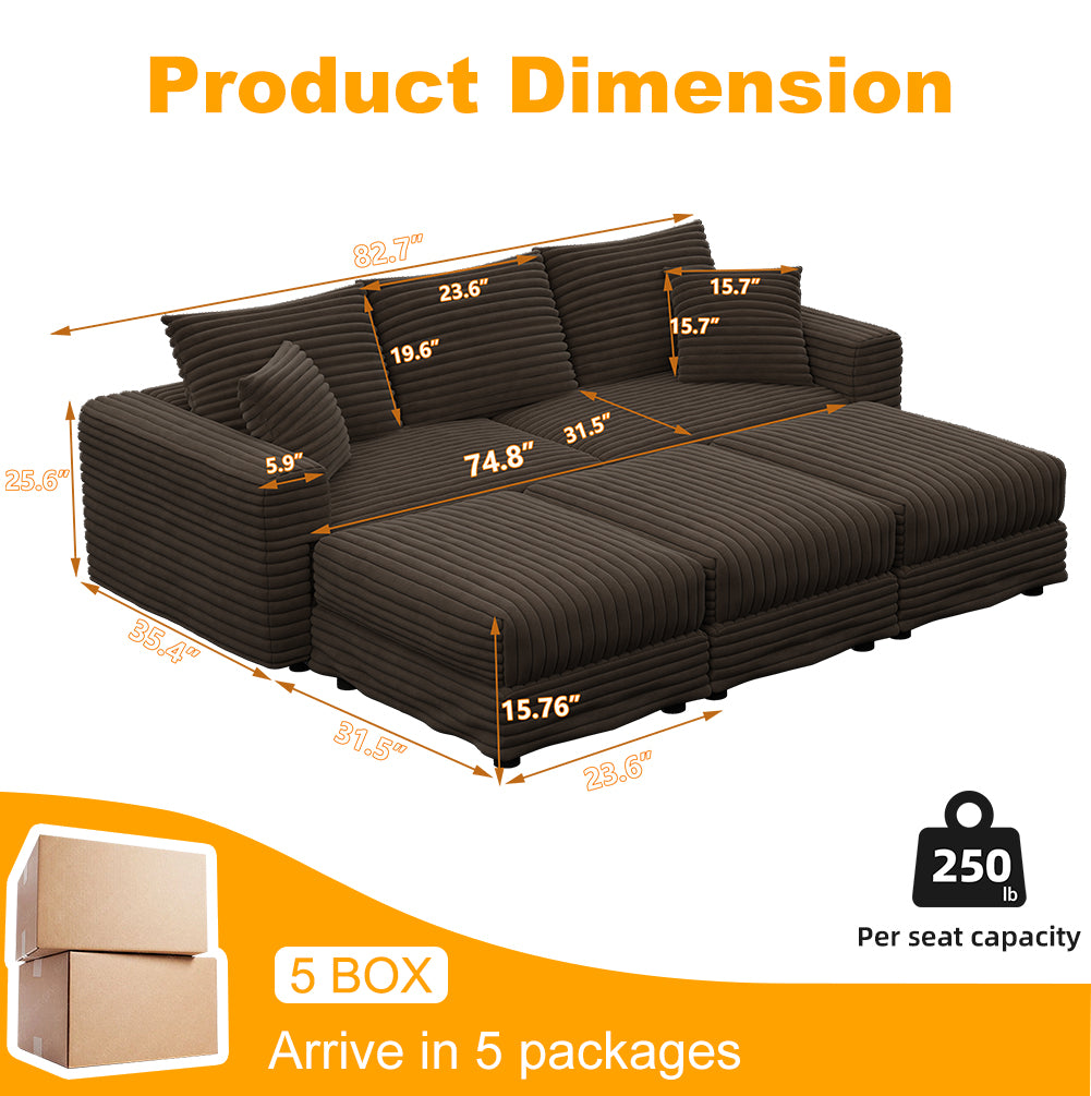 Experience cloud-like comfort and modern versatility with this plush corduroy 3-seat sofa — a stylish centerpiece designed for everyday lounging, entertaining, and relaxing. Crafted with a solid wood frame, high-density foam and cotton fill, and a soft corduroy upholstery, it delivers durable support and sumptuous softness. The modular ottomans and convertible design let you reconfigure the seating to suit movie nights, naps, or social gatherings. Easy to assemble and built to last, this sofa balances form and function for a cozy, contemporary living space.