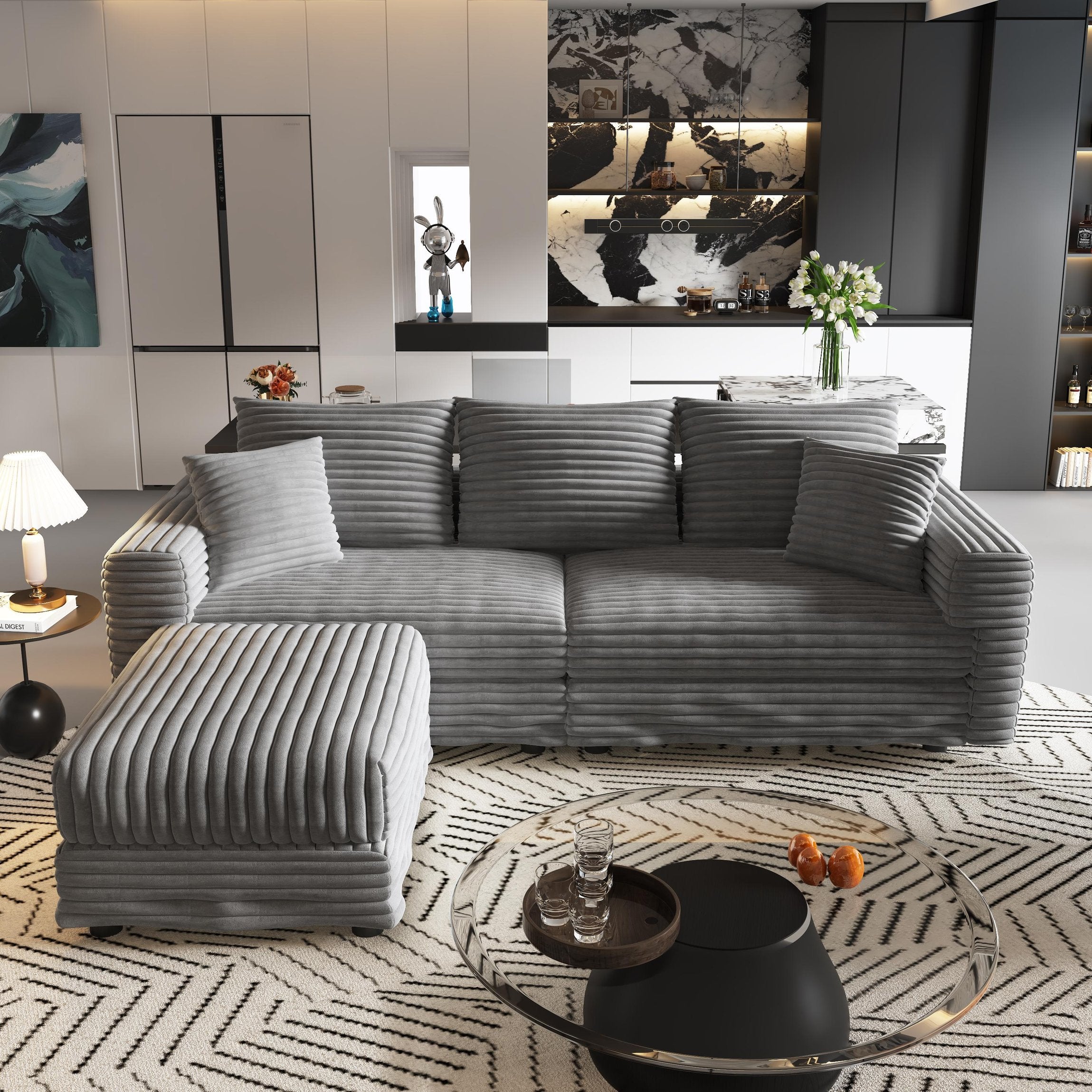 Sink into cloud-like comfort with this plush corduroy 3-seat sofa—designed to blend modern style, durable construction, and adaptable functionality for living rooms, apartments, or offices. Upholstered in soft, textured corduroy and filled with high-density foam and quality cotton, the sofa delivers full-body support with abundant rear cushions and included pillows. A movable ottoman lets you reconfigure the seating into sectional, U-shaped, or reclined lounge arrangements, while a sturdy solid wood frame and metal-spring seat construction ensure stability and long-term use.