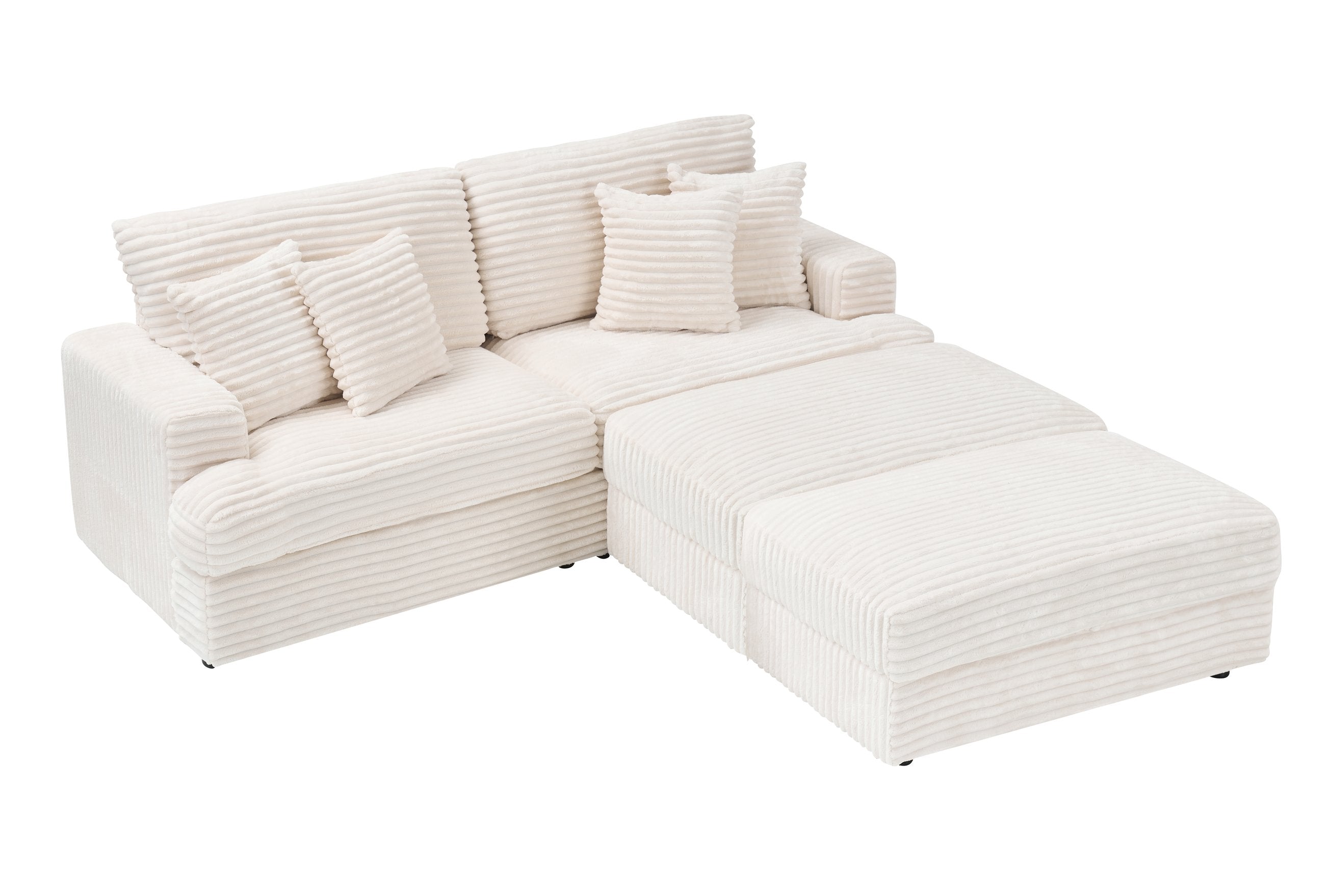 Sink into cloud-like comfort with this stylish corduroy sofa — a roomy, modern piece designed for living rooms, offices, or lounge areas. Built with a solid wood frame, resilient sponge cushioning, and thoughtful storage-ready legs, it blends soft texture with practical durability. Available in multiple colors and including four matching pillows, this sofa seats up to three people and supports up to 500 lbs.