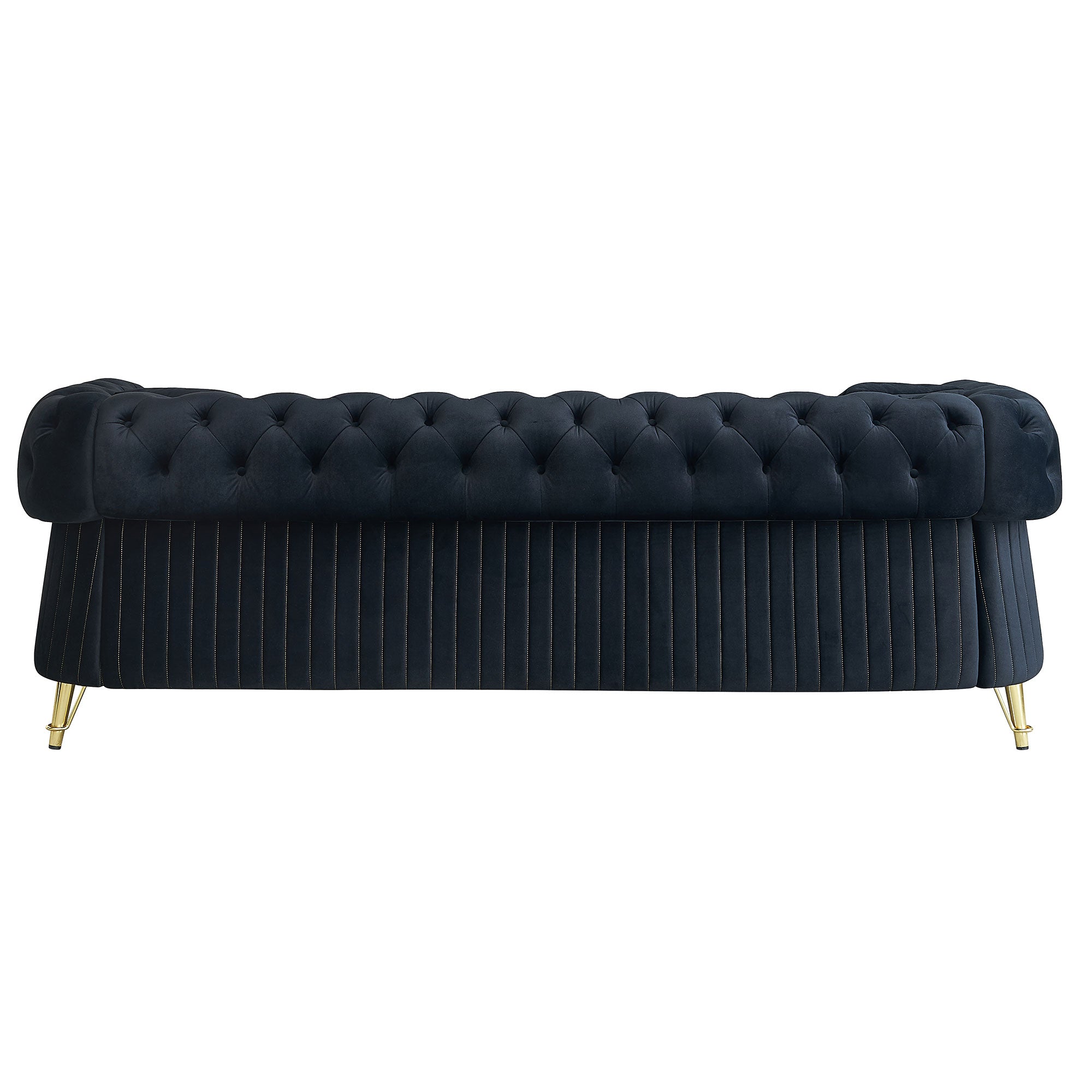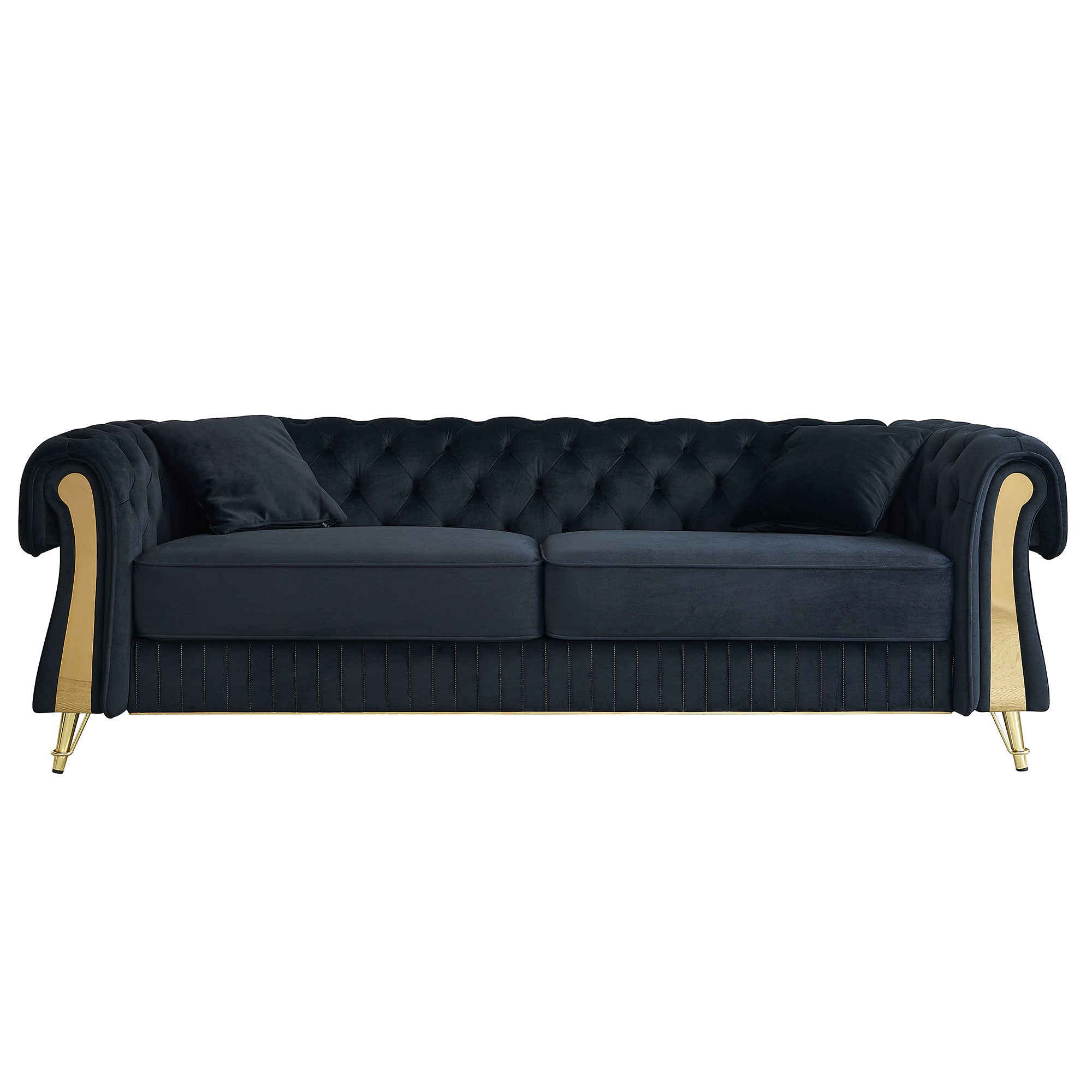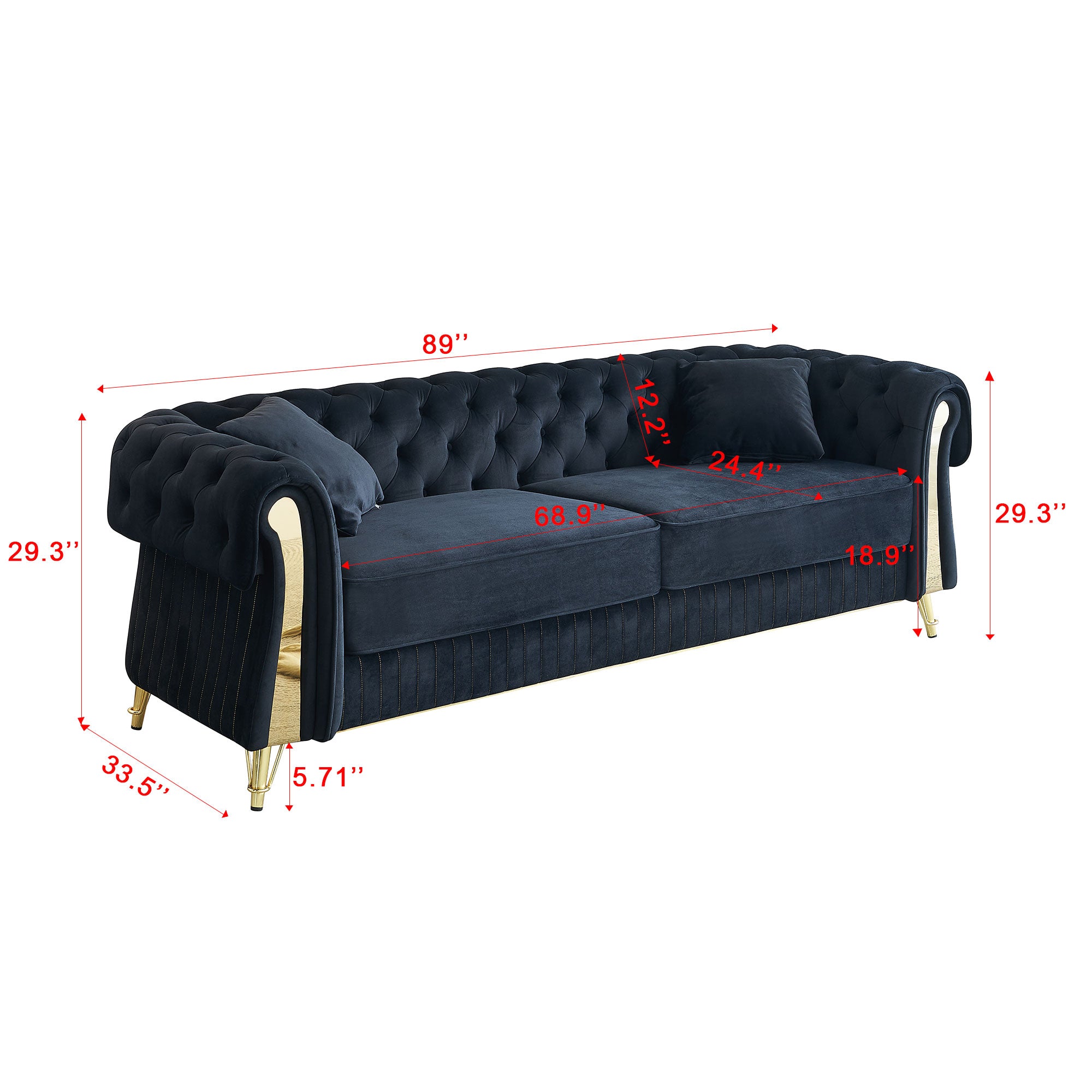 Elevate your living room with this elegant Chesterfield-style sofa that blends classic tufting with modern details. Upholstered in soft beige velvet and finished with metallic accents, it offers a luxurious look without sacrificing comfort. Designed for everyday use, the sofa features removable cushions, sturdy construction, and included toss pillows for added support and style.
