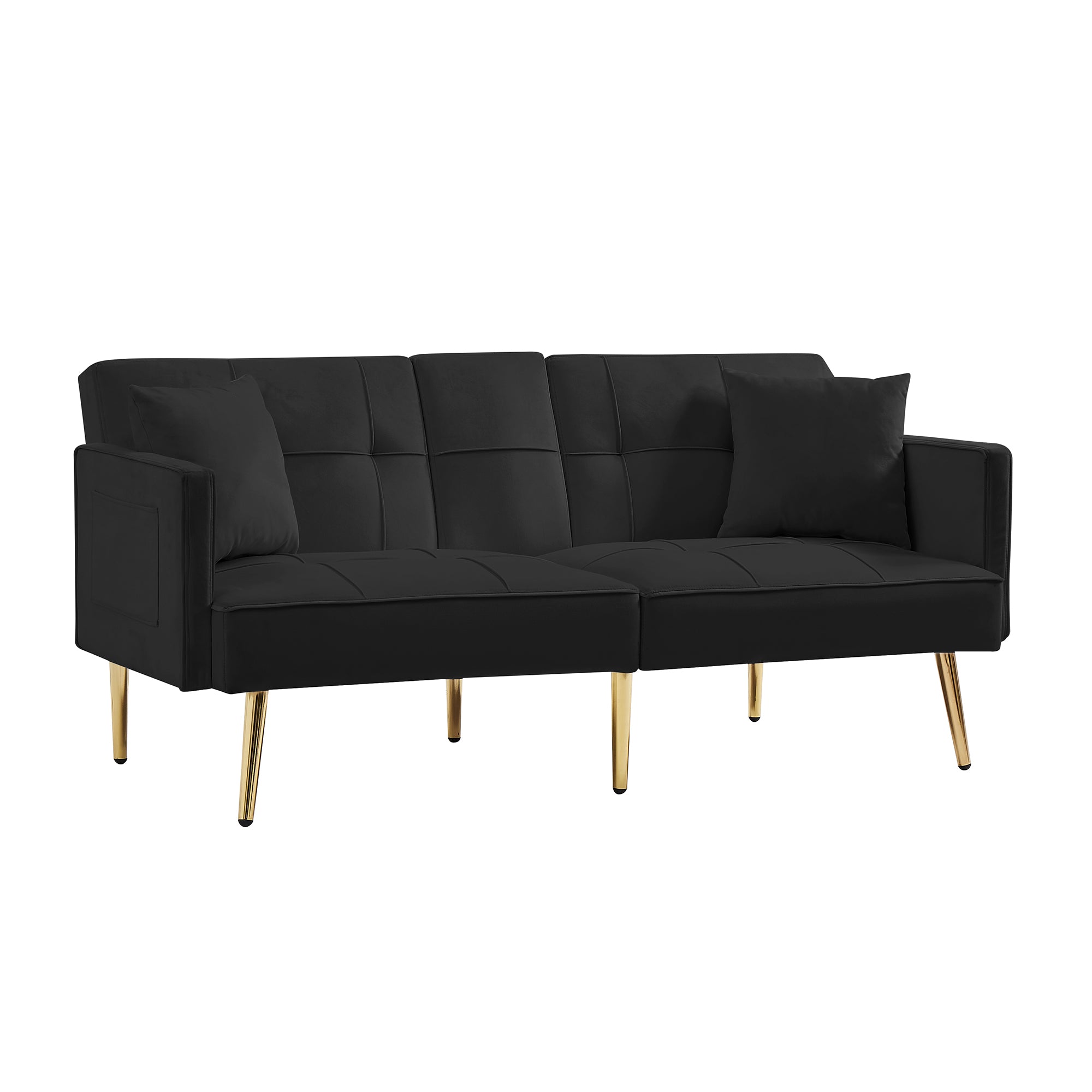 Upgrade your living space with this chic and versatile black velvet futon sofa bed — a stylish centerpiece that balances modern elegance with everyday functionality. Plush velvet upholstery, gold metal legs, and thoughtful conveniences like cup holders and side pockets make it ideal for small apartments, guest rooms, or multi-use spaces. It converts effortlessly between sofa and bed to accommodate lounging, entertaining, or overnight guests without sacrificing comfort or design.