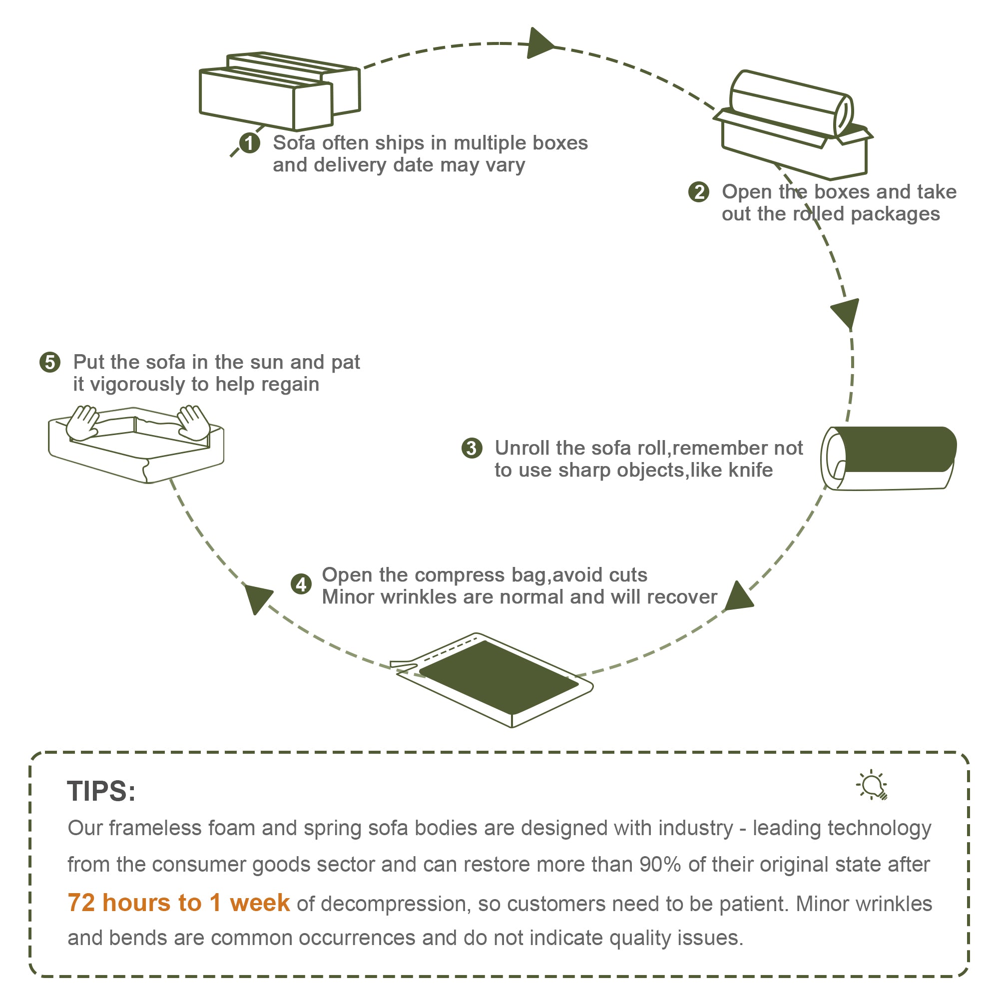 - No Assembly Required: Our modular sofa eliminates the hassle of complicated furniture setup – it's ready to arrange right out of the box. Simply unpack all components and gently pat each module to activate its elasticity, restoring its beautiful shape.