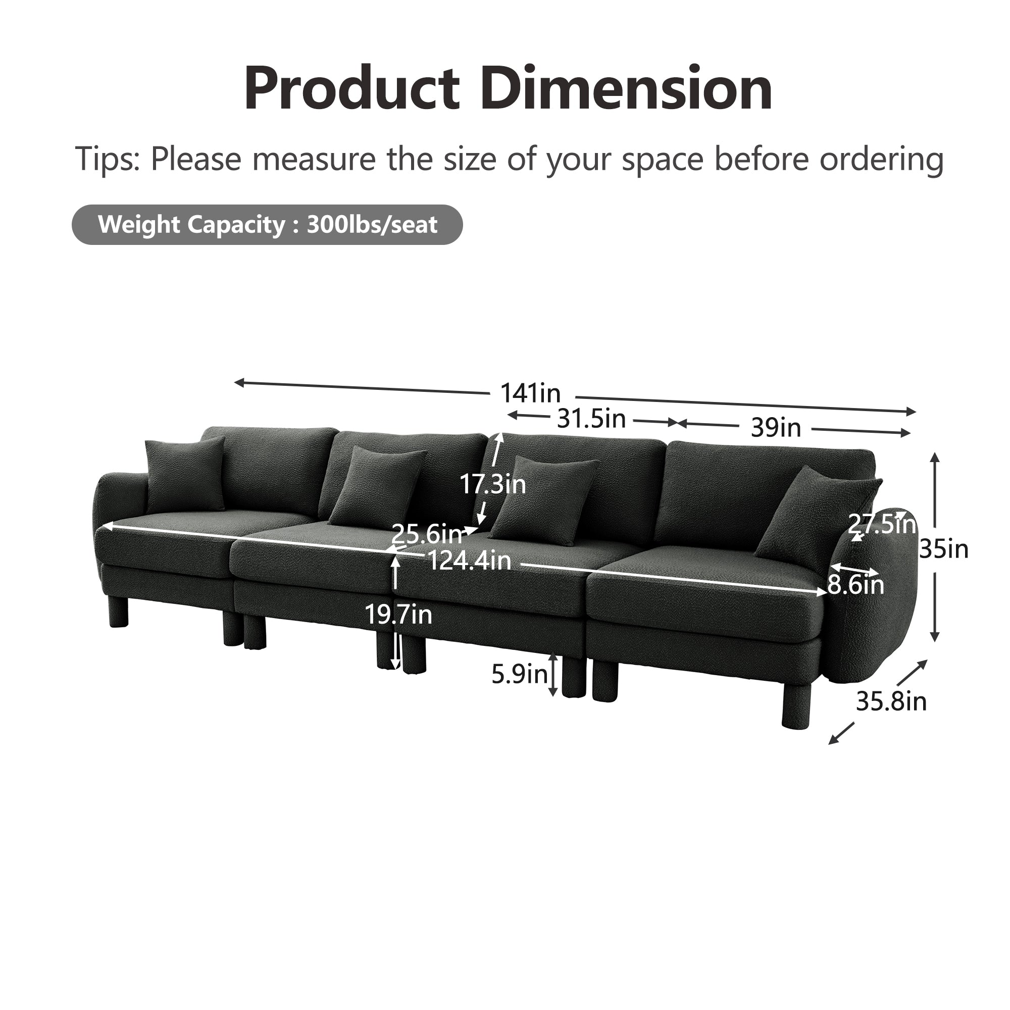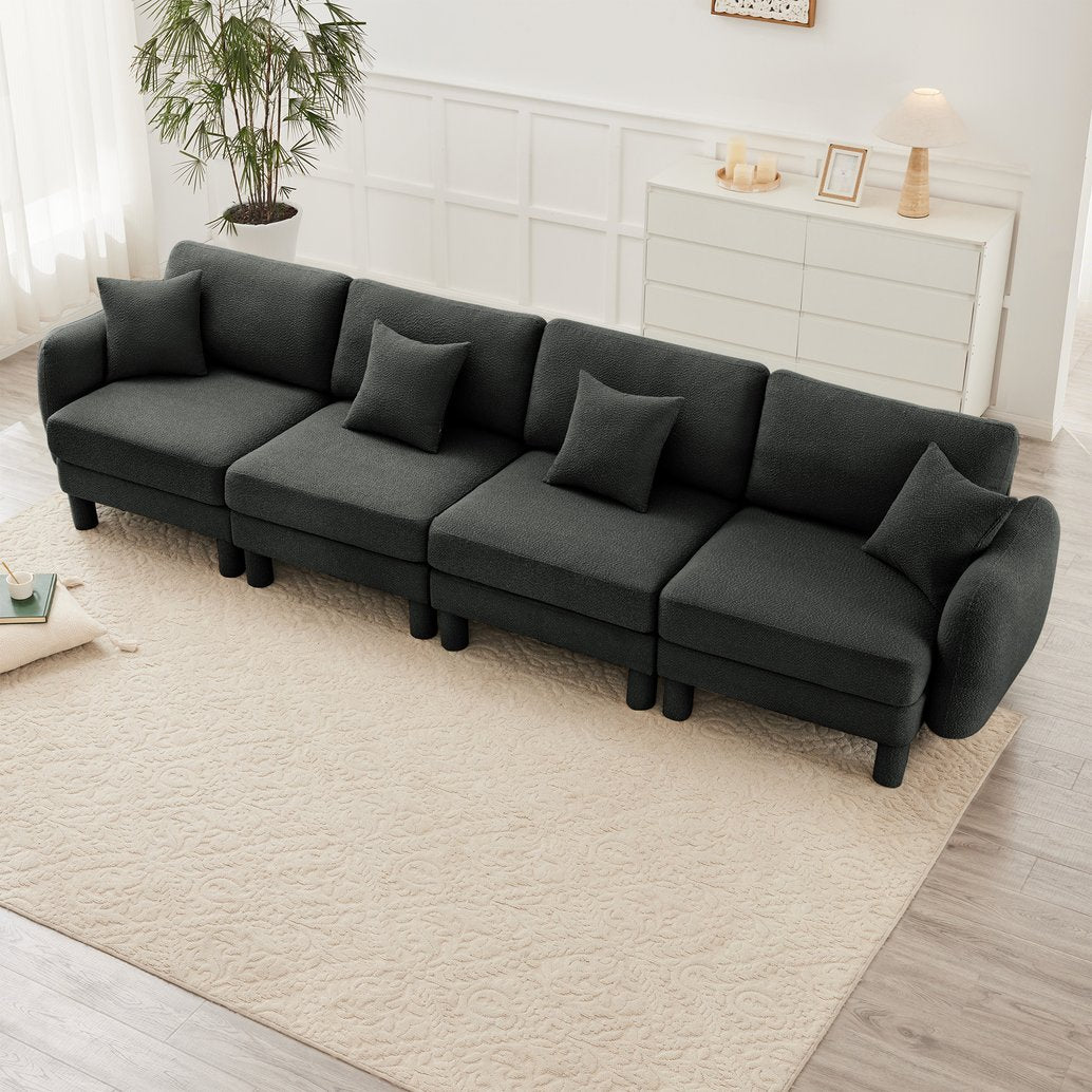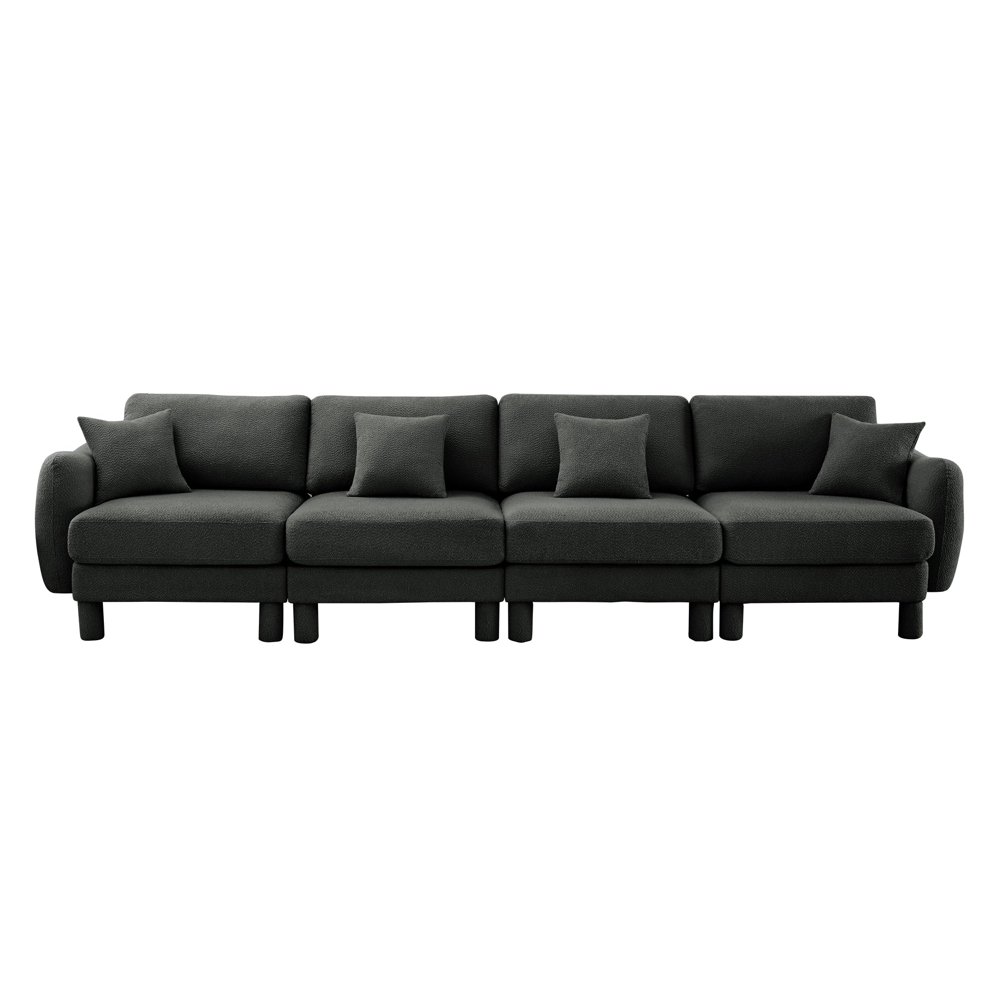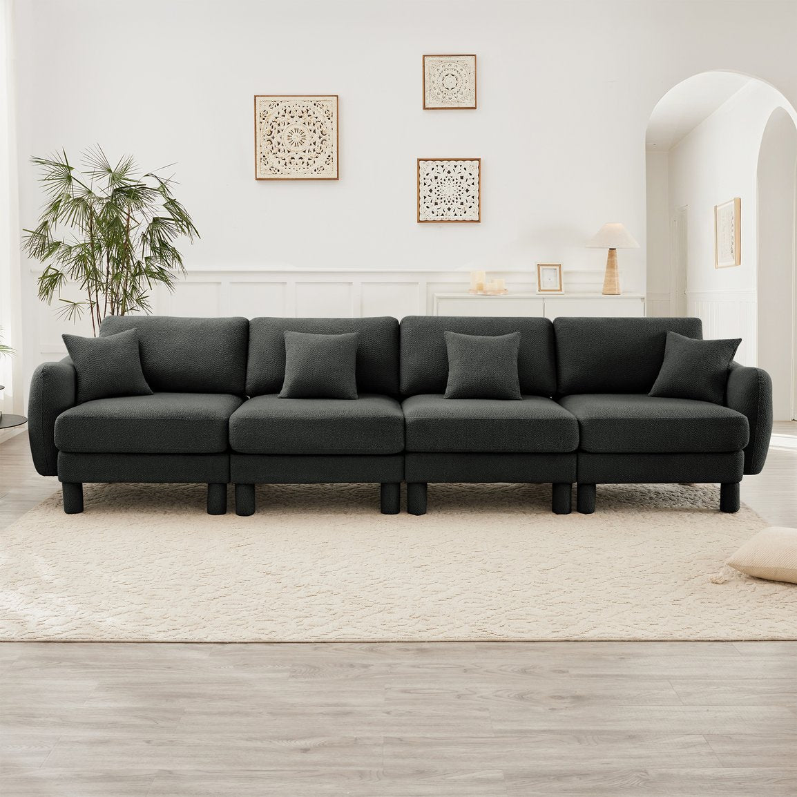This elegant four-seater boucle sofa combines modern sculptural style with everyday comfort. Wrapped in soft, breathable dark gray boucle fabric and supported by cylindrical legs covered in matching self-fabric, it brings understated luxury and a cohesive look to living rooms, lounges, offices, or bedrooms while offering durable construction and plush seating for daily use.