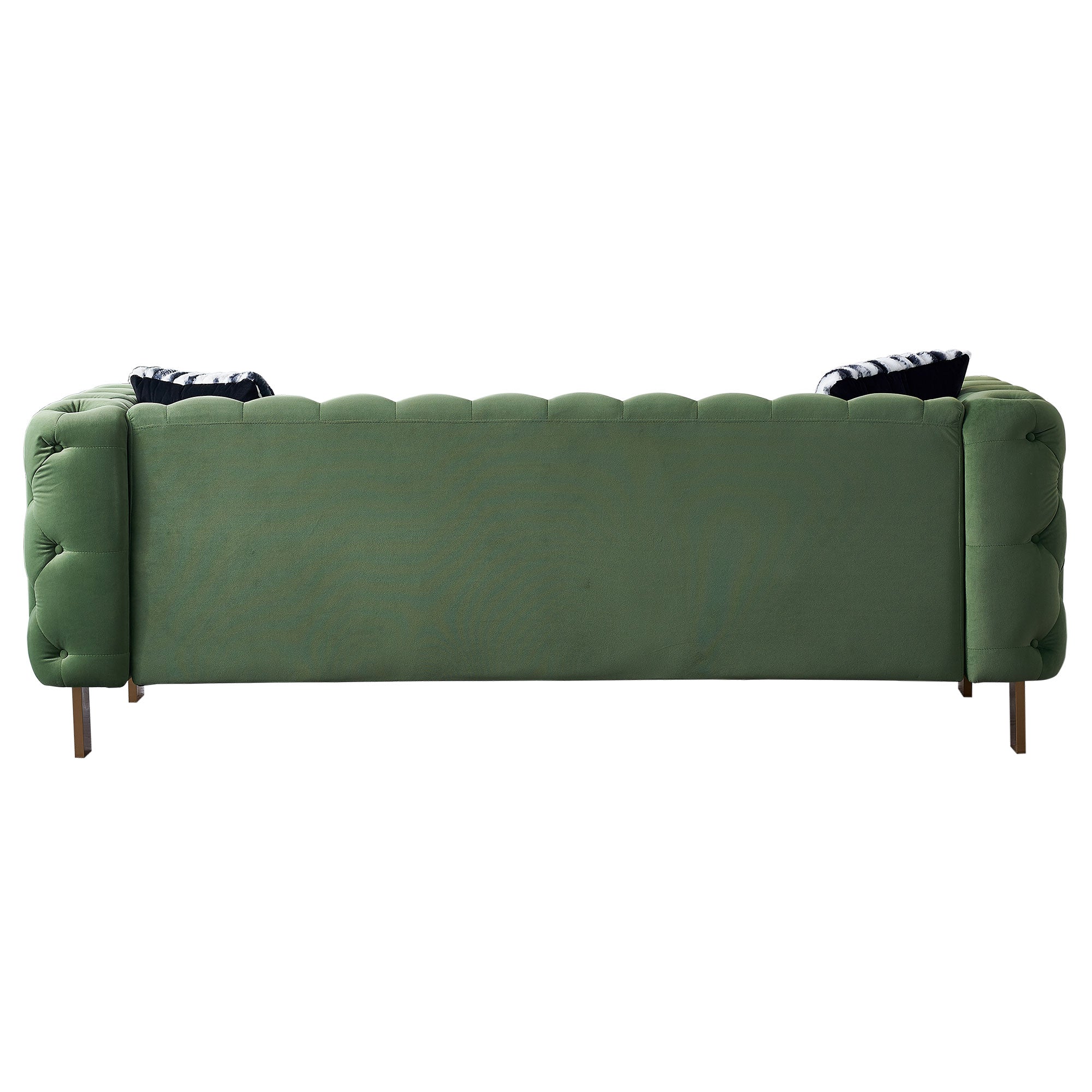 - Our velvet couch features velvet button tufting along the back and around the sides. The striking gold metal legs are more than a background feature, extending into the arms.