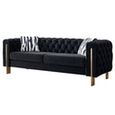 This modern tufted velvet sofa brings a refined, contemporary look to your living room, bedroom, or office. With classic button-tufted detailing, sleek gold metal legs, and a streamlined silhouette, it combines comfort and style to serve as a striking focal point or a versatile accent piece that complements a variety of decor schemes.