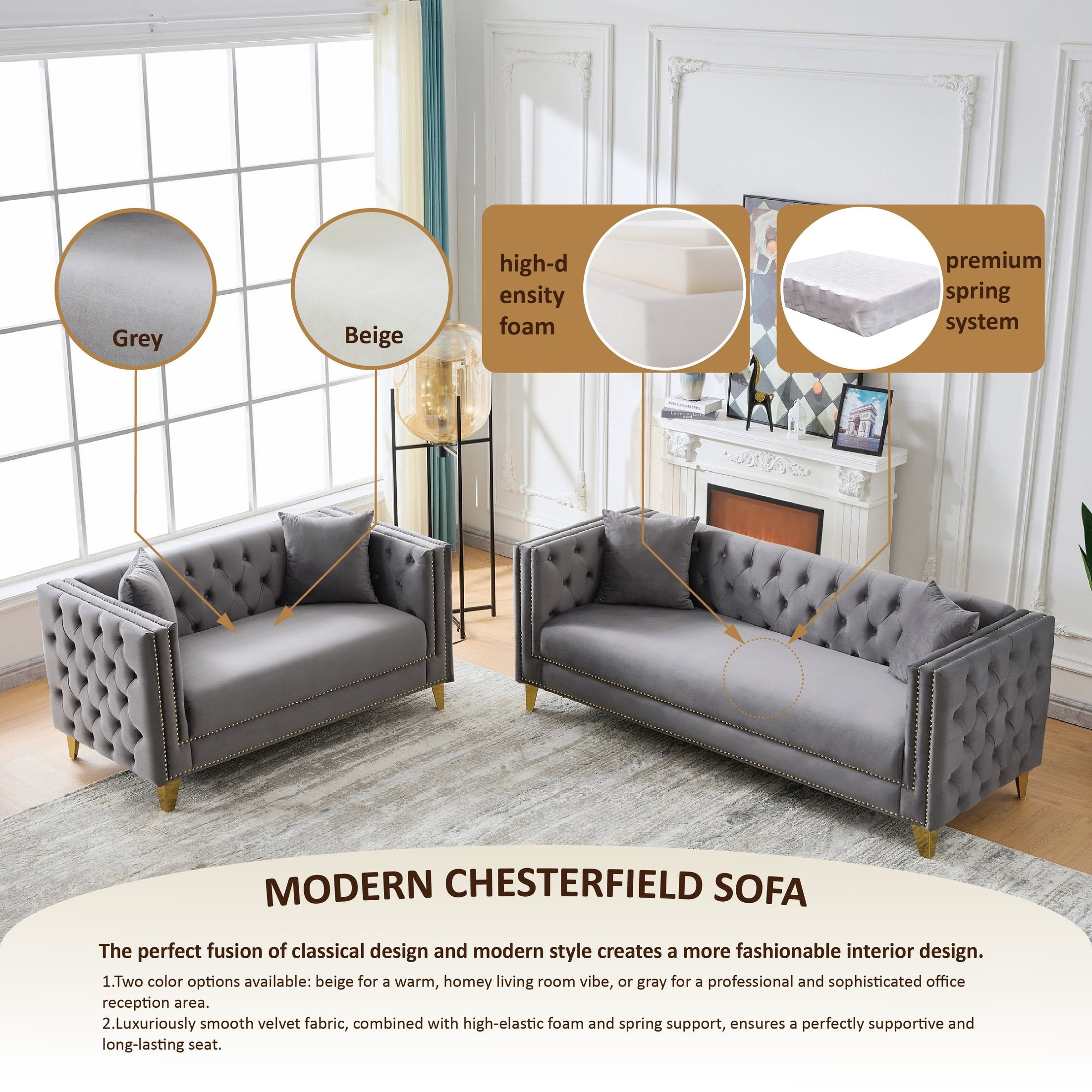 Enjoy classic Chesterfield elegance with modern comfort—this deep-seat velvet sofa set brings timeless tufted detailing, nailhead trim, and a tailored square-arm silhouette to your living room, bedroom, or office. Built for both style and everyday use, the plush velvet upholstery, high-density cushions, and solid construction deliver refined looks and lasting support.
