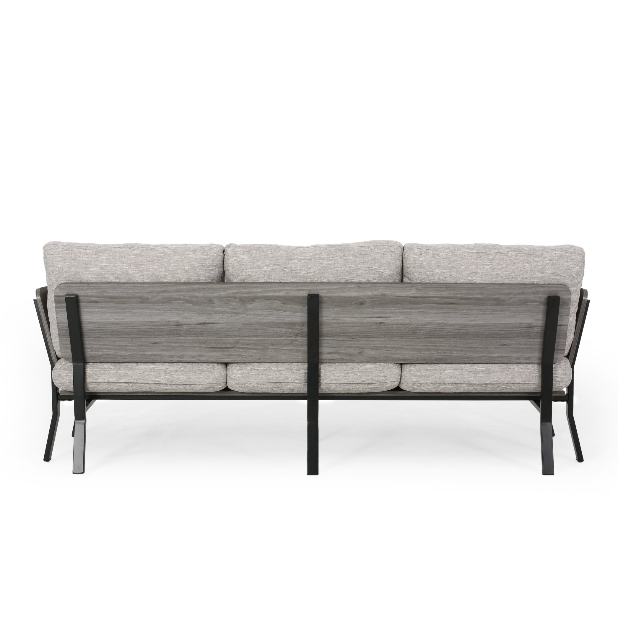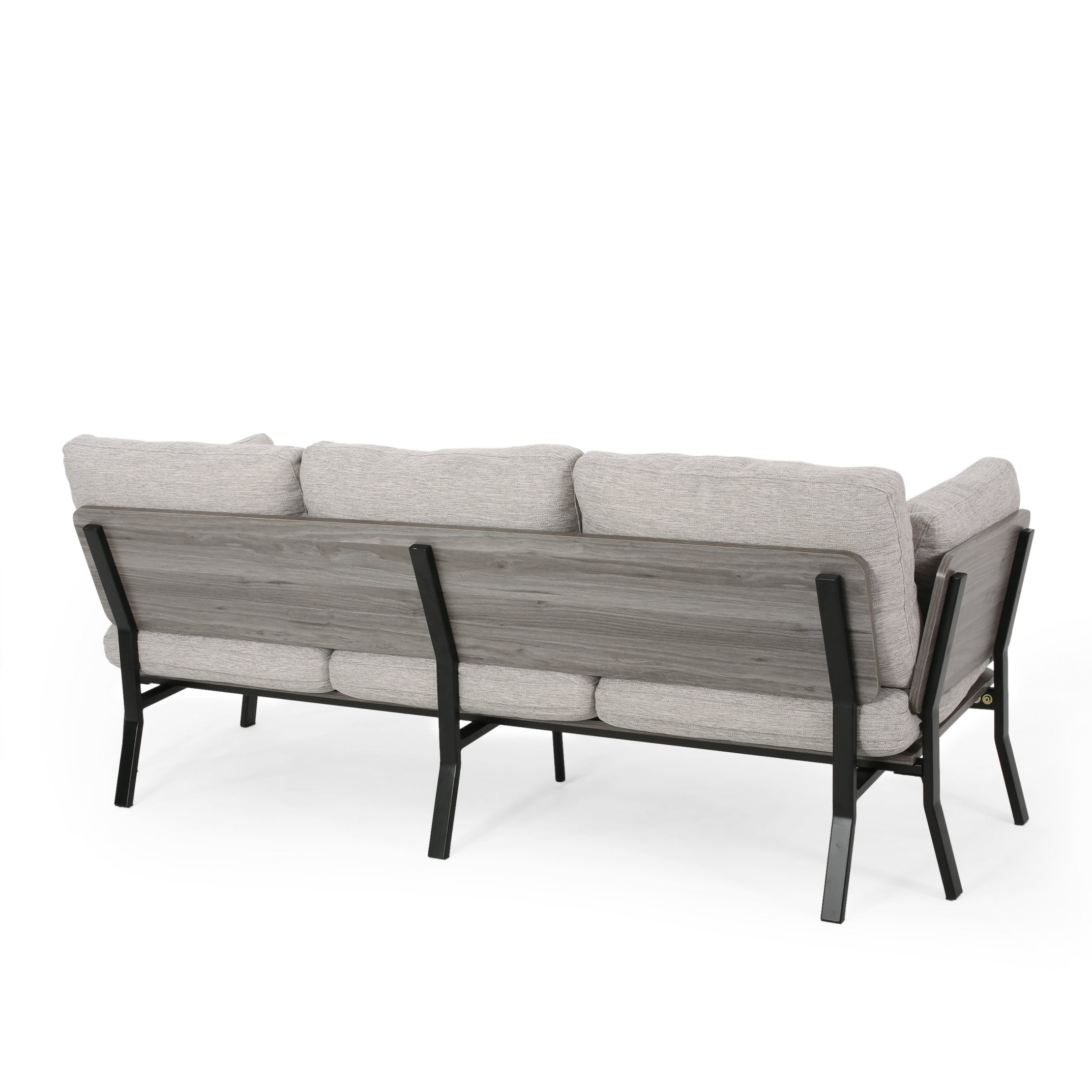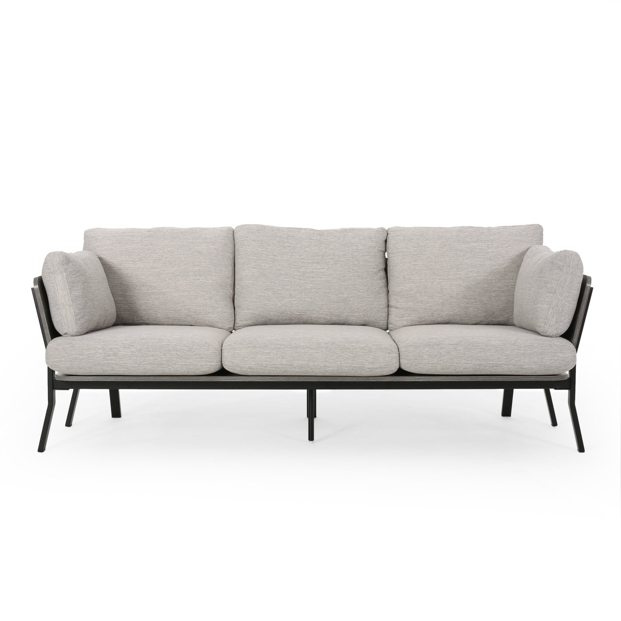 Bring modern comfort and understated style to your living room with this mid-century inspired 3-seater sofa. Upholstered in light grey fabric and finished with angled iron legs and an exposed faux-wood frame, it pairs plush pillow-style cushions with clean, tailored lines for a cozy yet contemporary focal point.