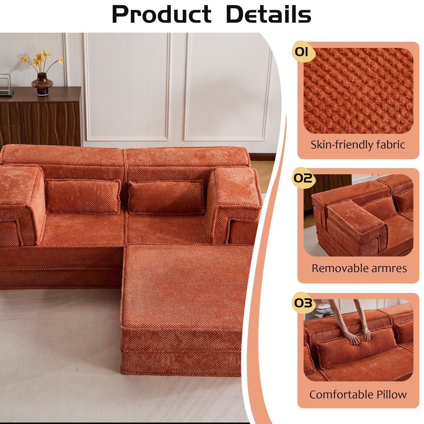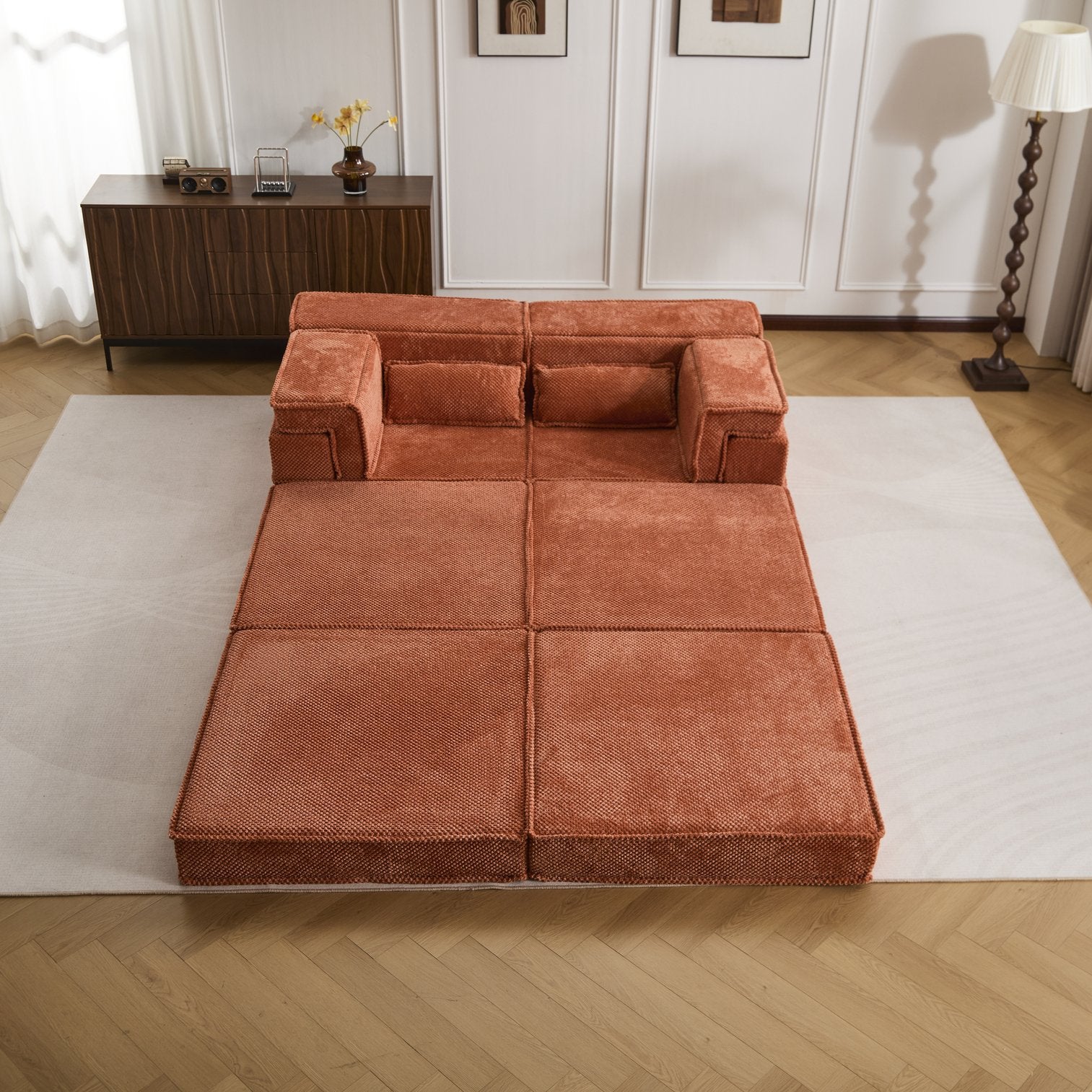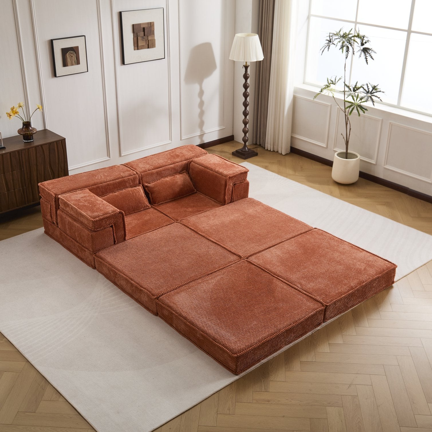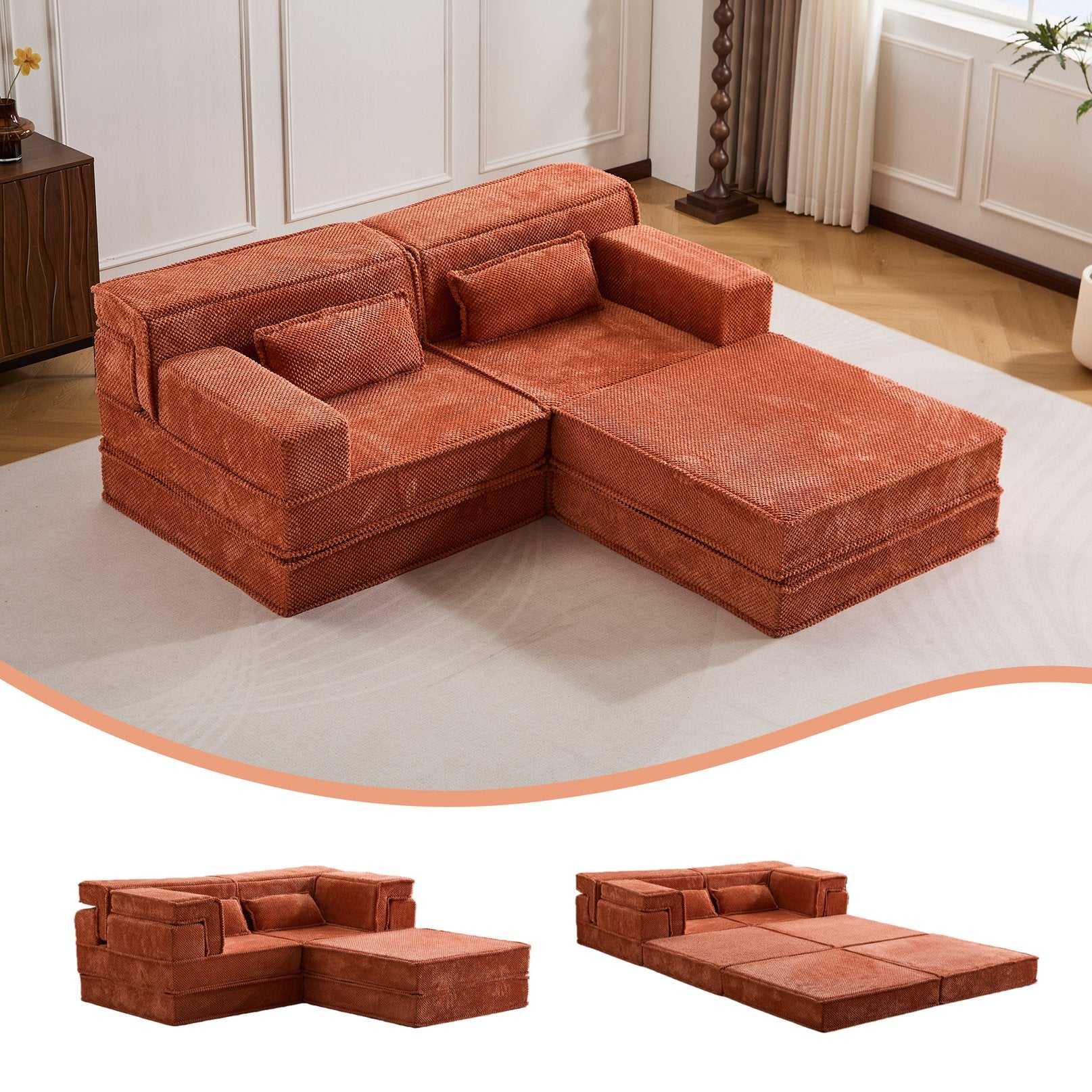 - Convertible modular design: Separate segments allow DIY configurations — 3-seater, L-shape, loveseat, individual chairs, floor sofa with ottoman, or a flat bed