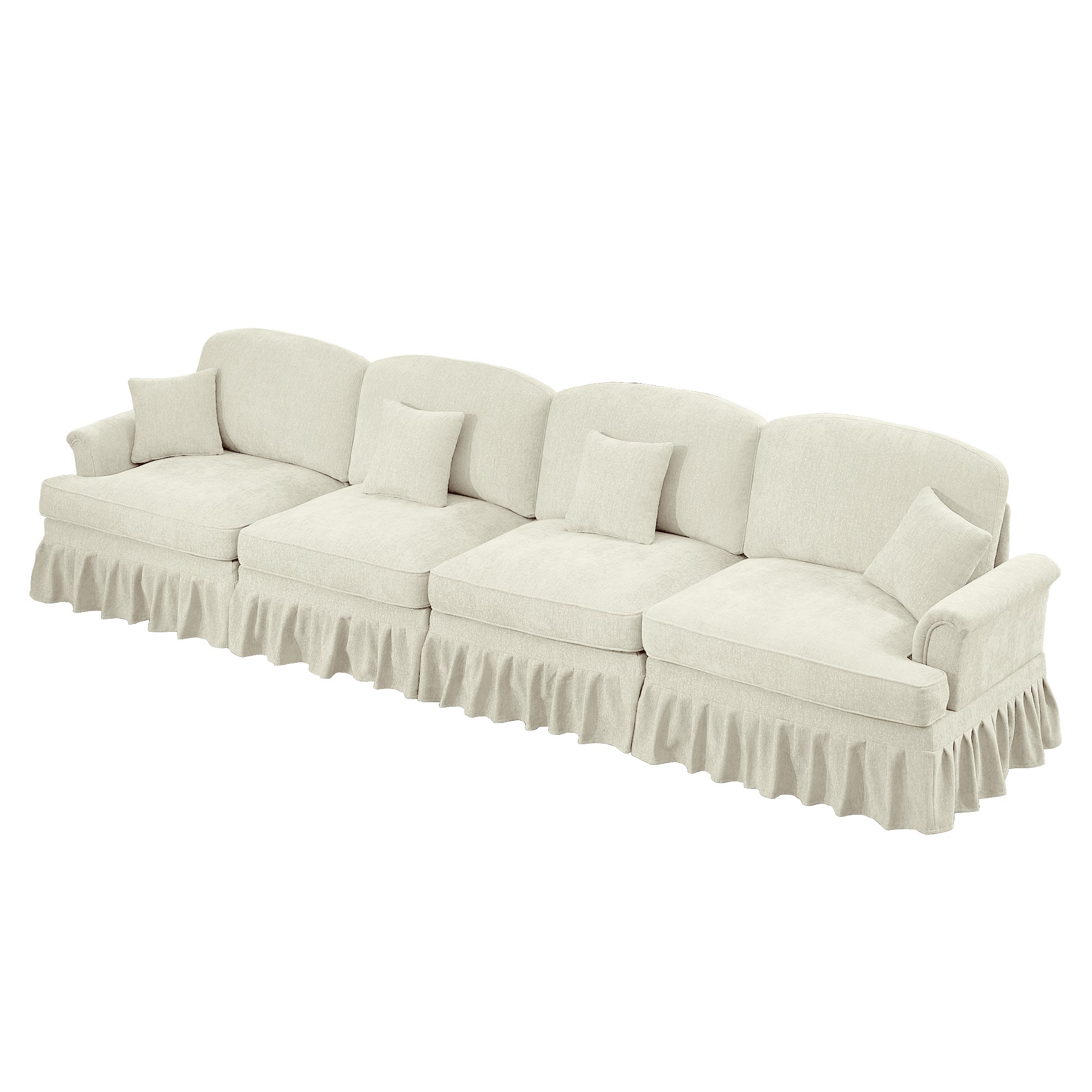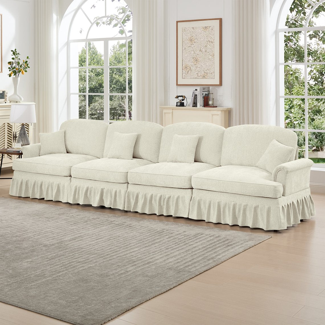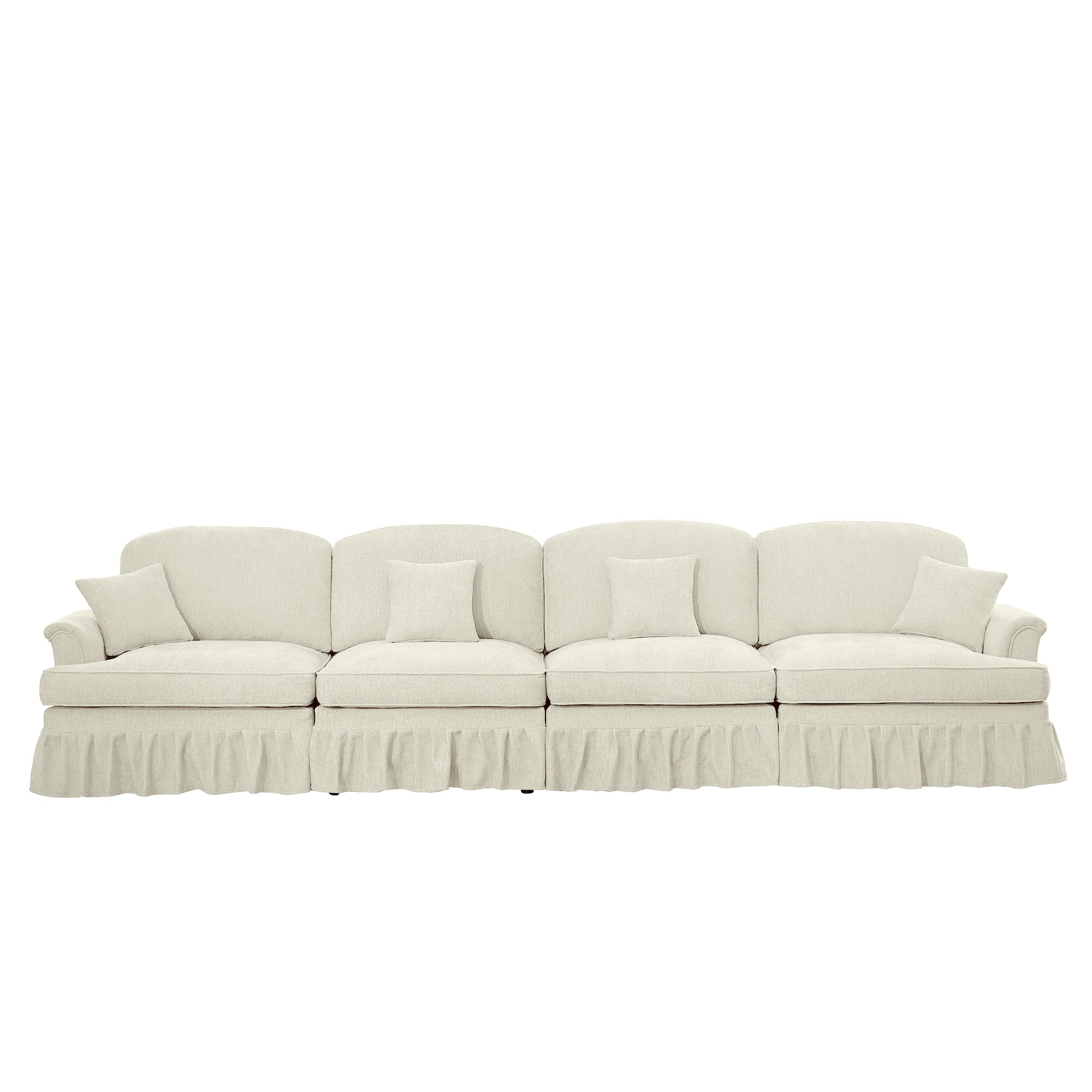 Enjoy timeless mid-century style with modern comfort. This elegant four-seater chenille sofa pairs a graceful silhouette—flared petal arms, spindle legs, and a flower-shaped back—with versatile details like removable ruffled skirts so you can switch between a refined, skirted look and a cleaner mid-century profile. Deep, segmented cushioning and high-density foam deliver supportive comfort for lounging, entertaining, or family movie nights, while premium chenille with subtle silver threads adds a soft, luxurious touch.