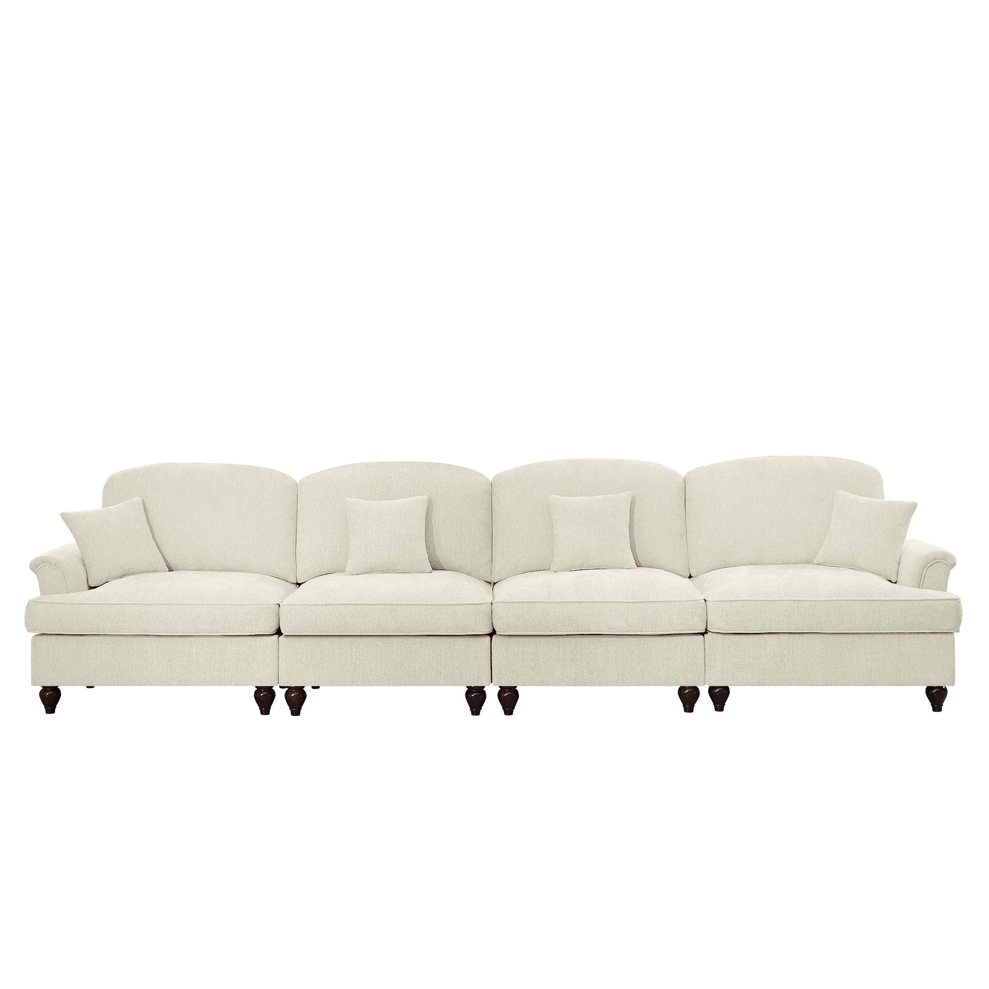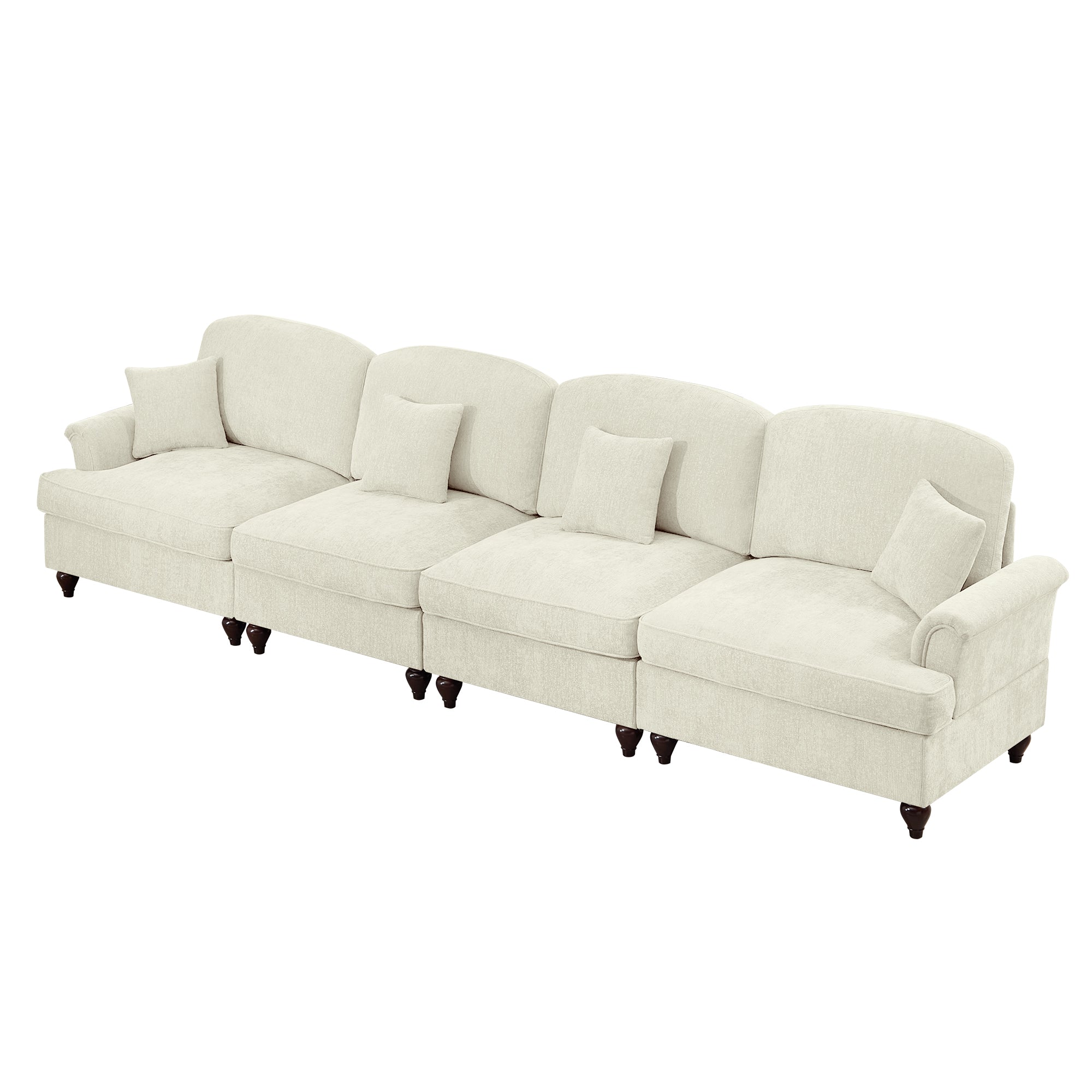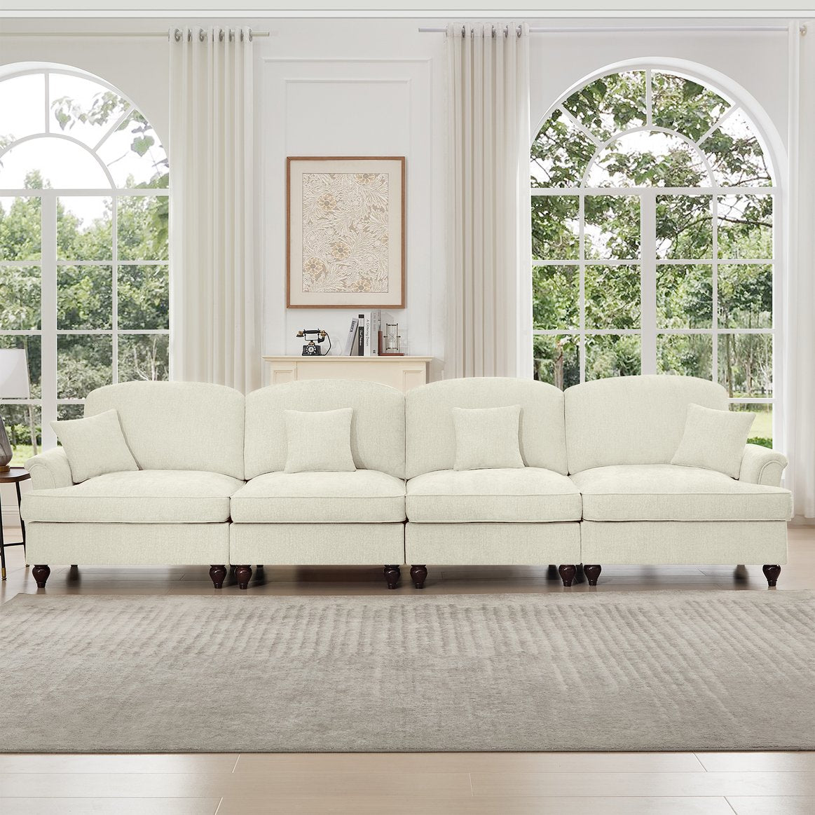 Enjoy timeless mid-century style with modern comfort. This elegant four-seater chenille sofa pairs a graceful silhouette—flared petal arms, spindle legs, and a flower-shaped back—with versatile details like removable ruffled skirts so you can switch between a refined, skirted look and a cleaner mid-century profile. Deep, segmented cushioning and high-density foam deliver supportive comfort for lounging, entertaining, or family movie nights, while premium chenille with subtle silver threads adds a soft, luxurious touch.