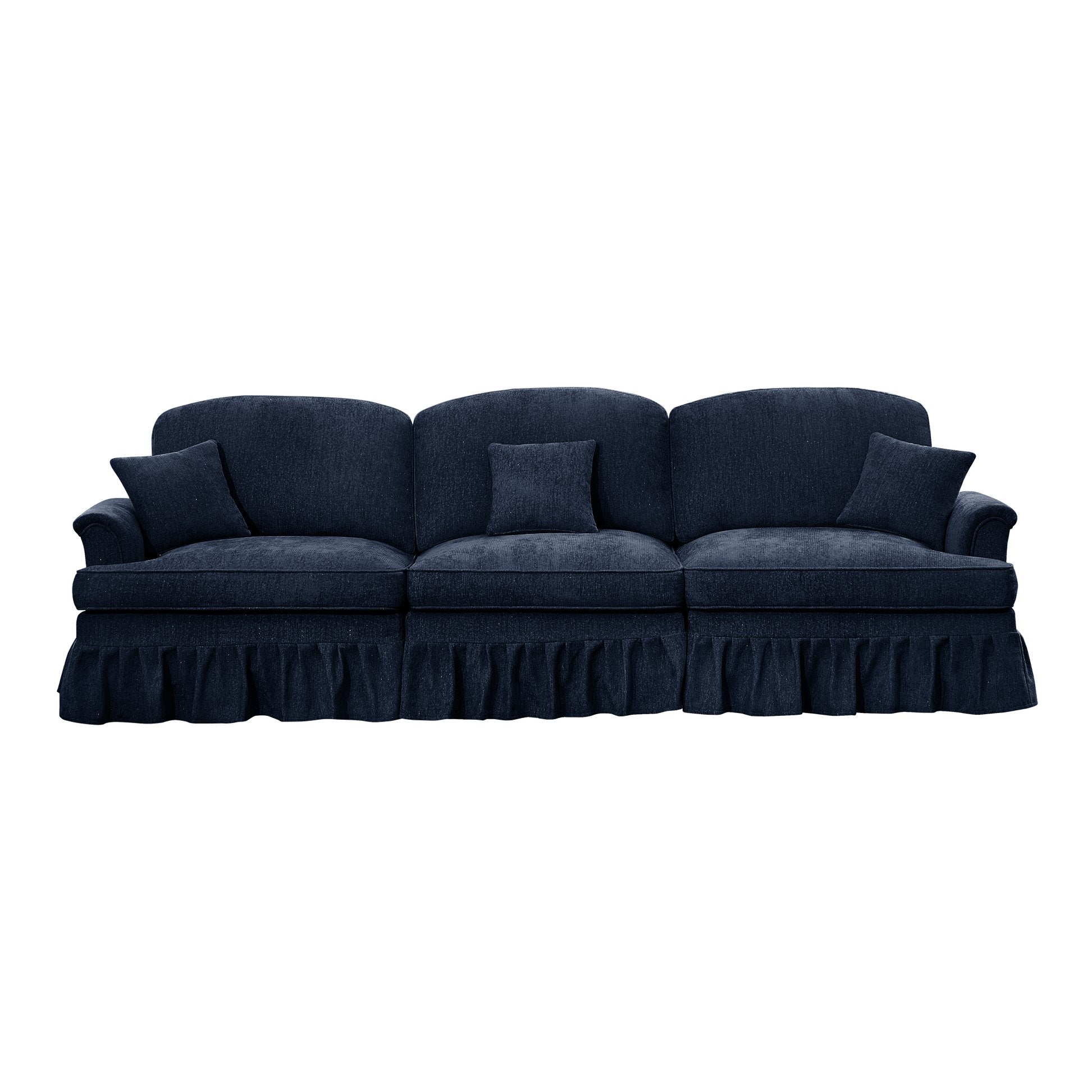 Transform your living room with this elegant, versatile three-seater sofa that blends mid-century charm with contemporary comfort. Designed for style and adaptability, it features flared arms, a petal-shaped back, and spindle legs, plus removable ruffled pleat skirts so you can switch between a refined, feminine look and a clean mid-century silhouette in seconds.