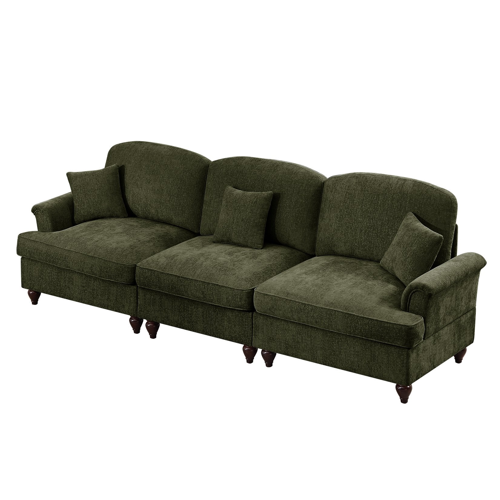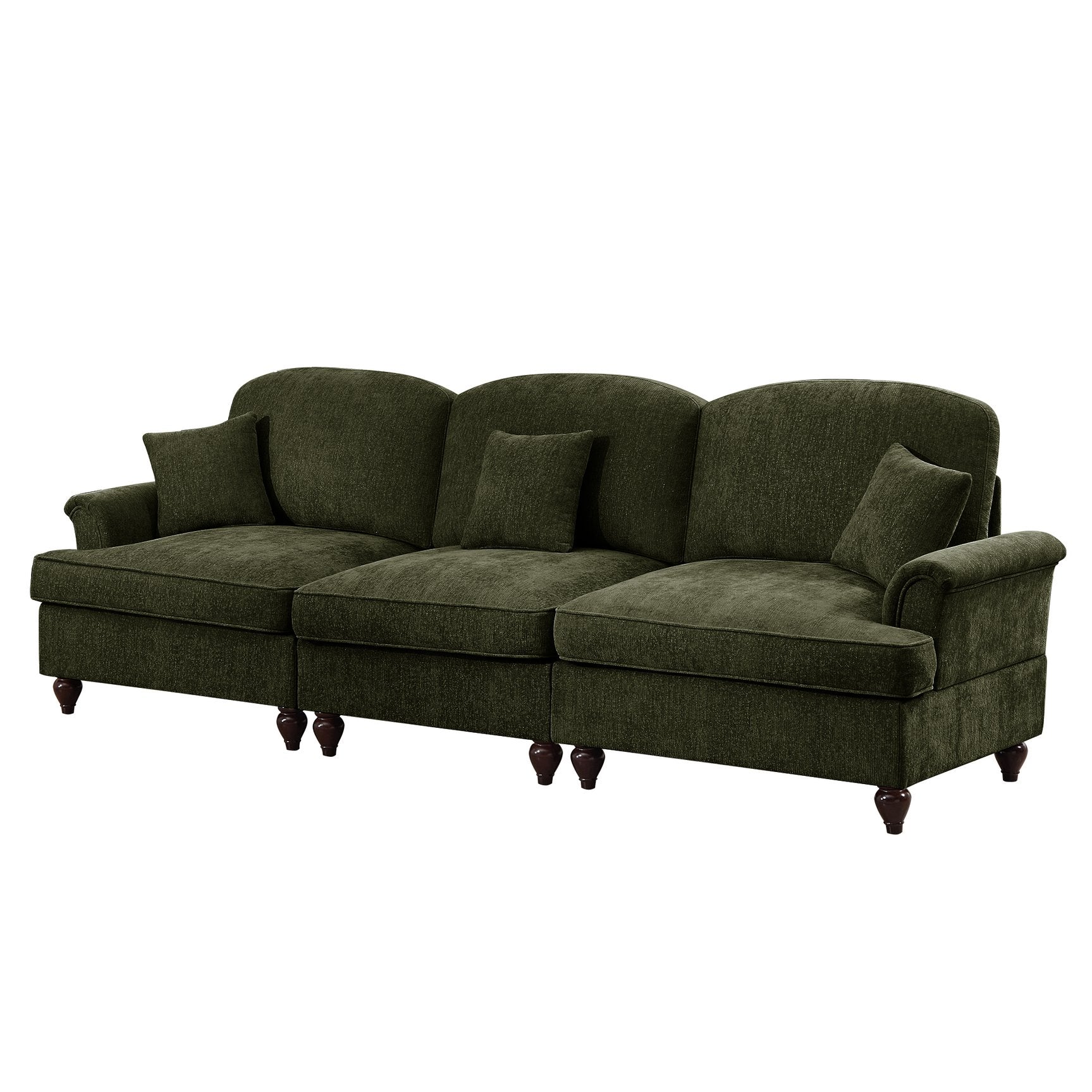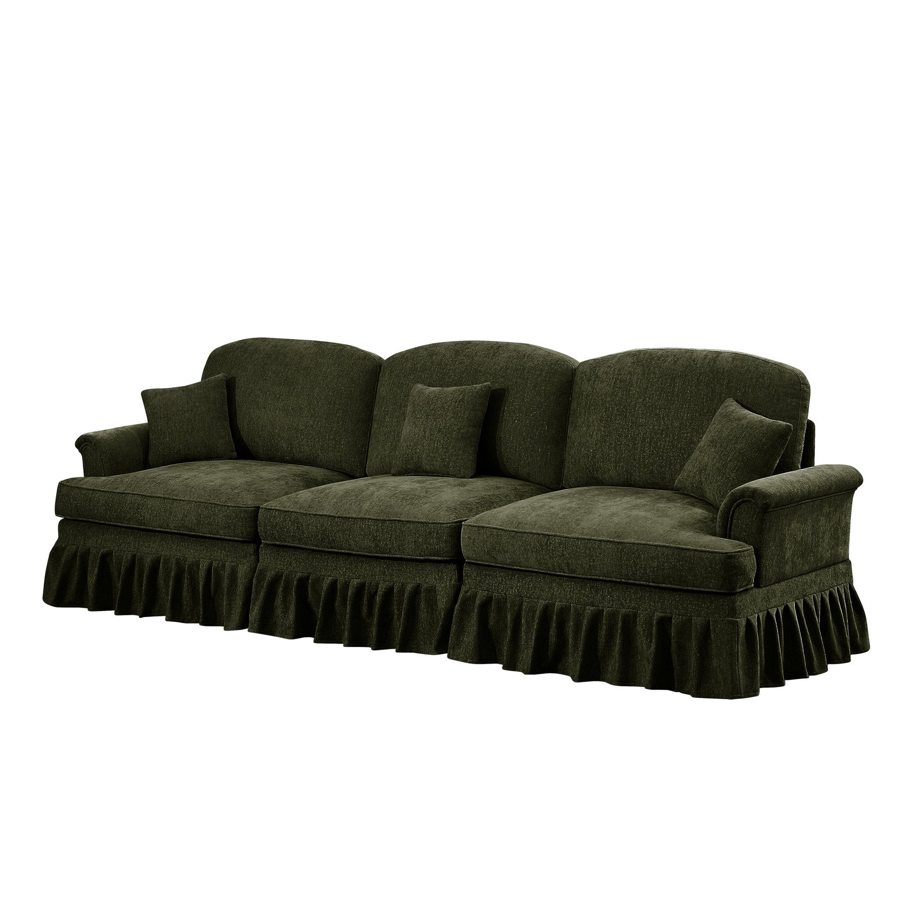 Transform your living room with this elegant, versatile mid-century inspired three-seater sofa. Soft chenille upholstery, petal-shaped flared arms and a segmented back create a refined silhouette while high-density foam and a movable throw pillow deliver lasting comfort. Detachable ruffled pleat skirts and spindle legs let you switch between a dressy, classic look and a clean mid-century style—giving you two sofas in one to suit changing décor or occasions.