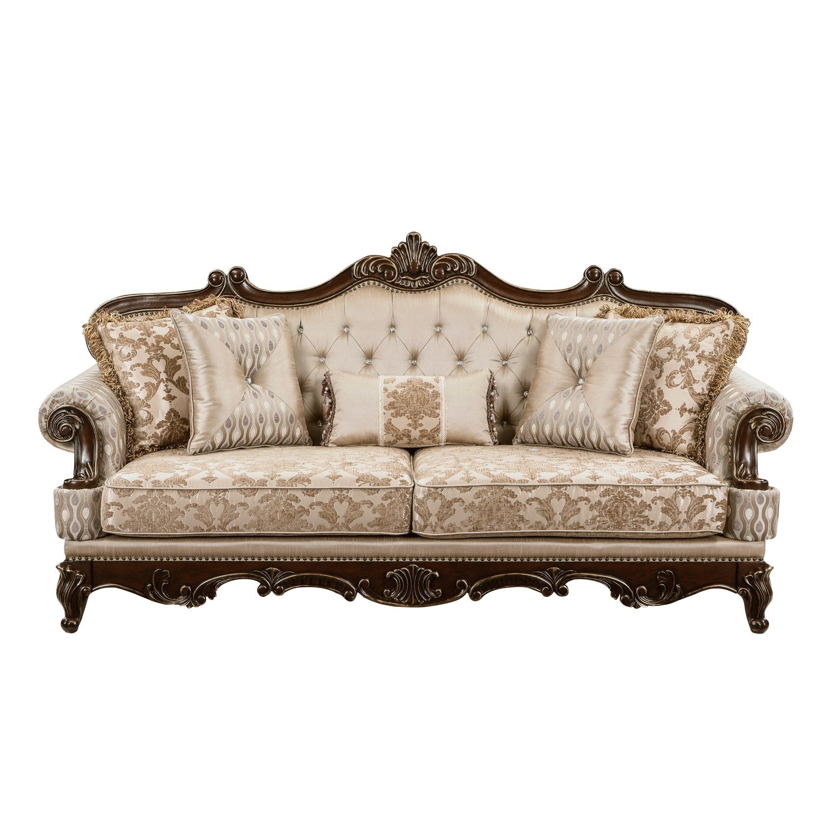 Elevate your living room with a formal, traditional sofa that blends classic craftsmanship and luxurious detailing. The Balthasar sofa features a rich cherry wood frame with gold tipping, patterned brown chenille upholstery, faux crystal tufting, and decorative trim for a refined, statement-making centerpiece. Rounded arms, contoured arm fronts, and five coordinating toss pillows complete the sophisticated silhouette—perfect for upscale residential or formal entertaining spaces.