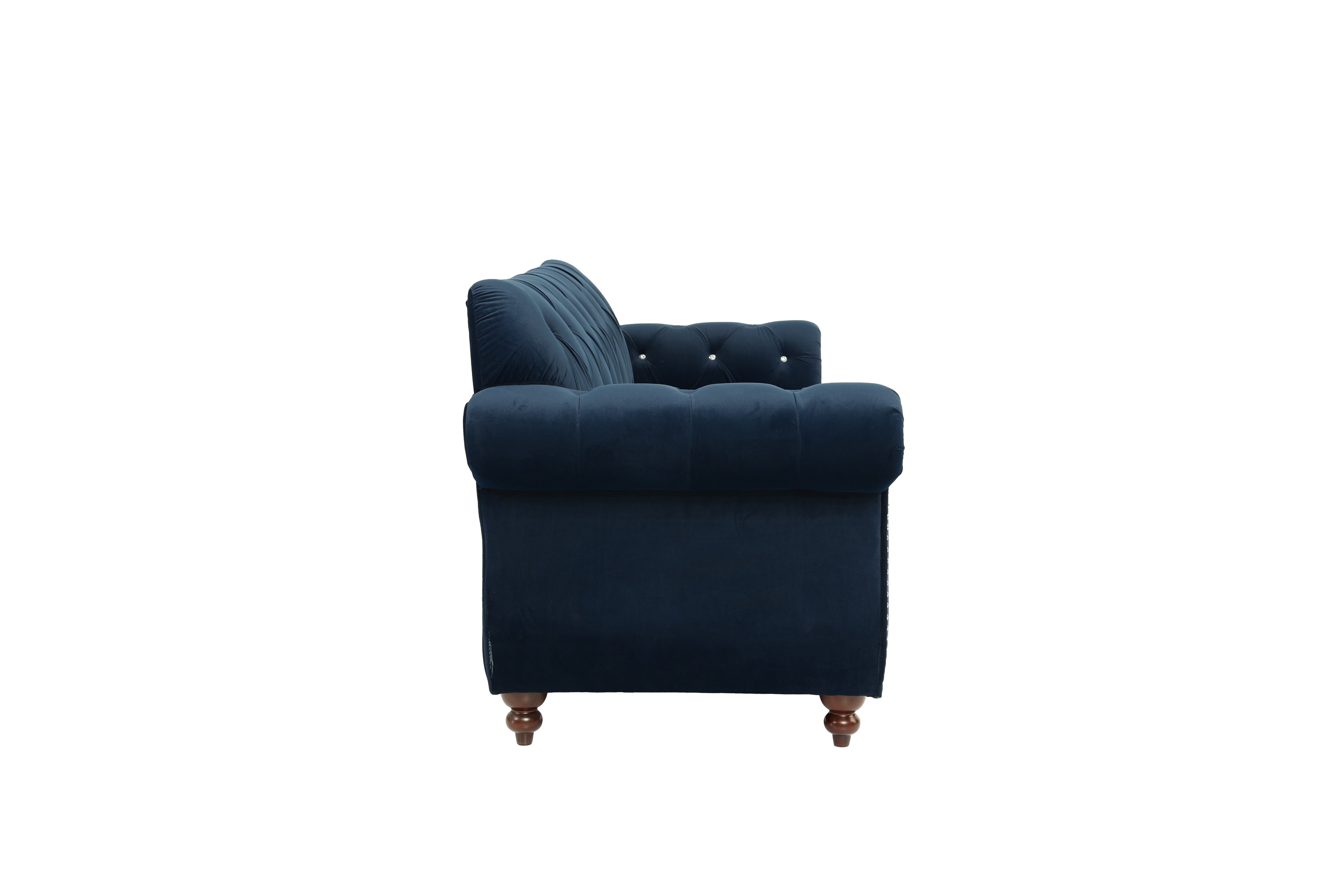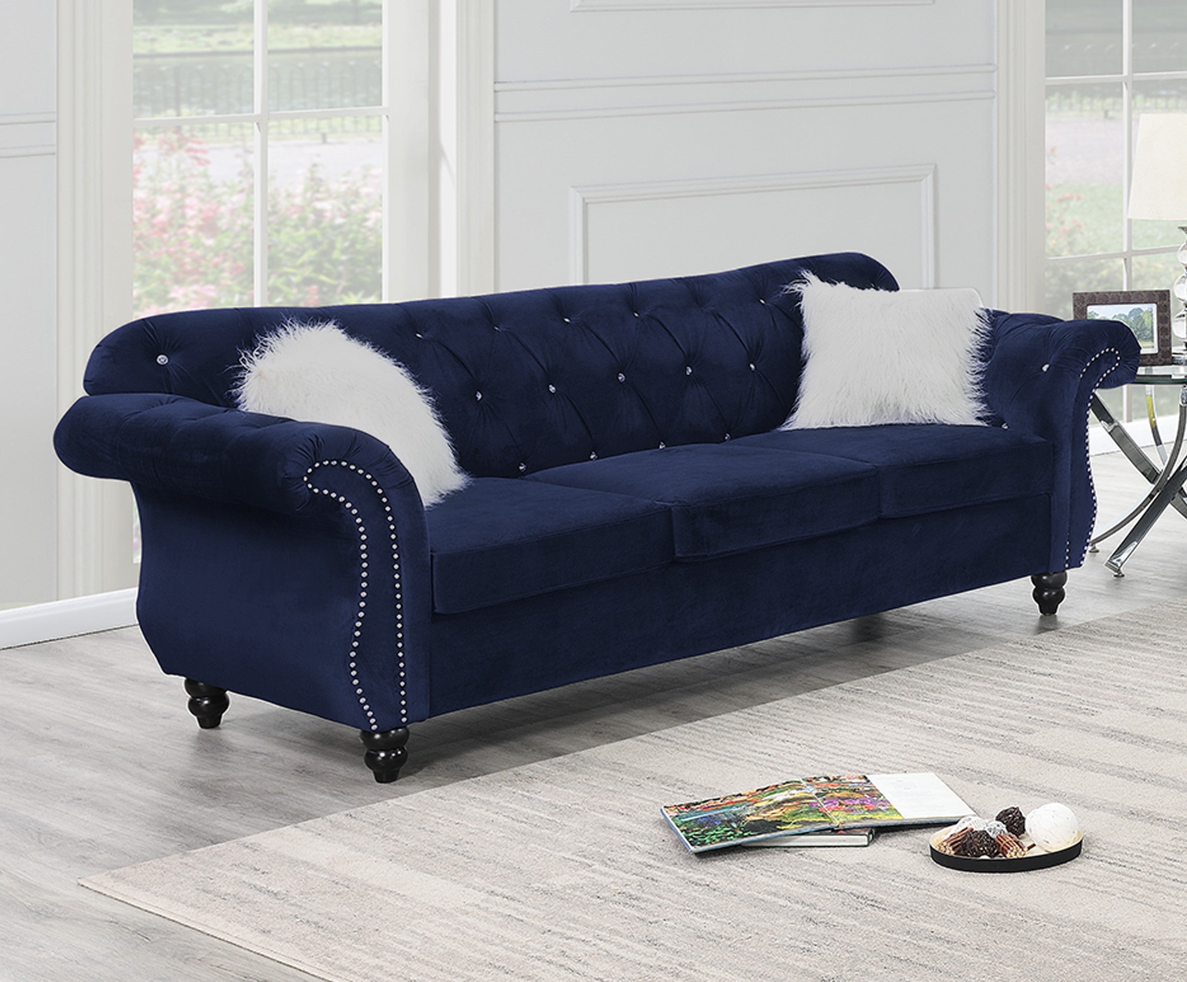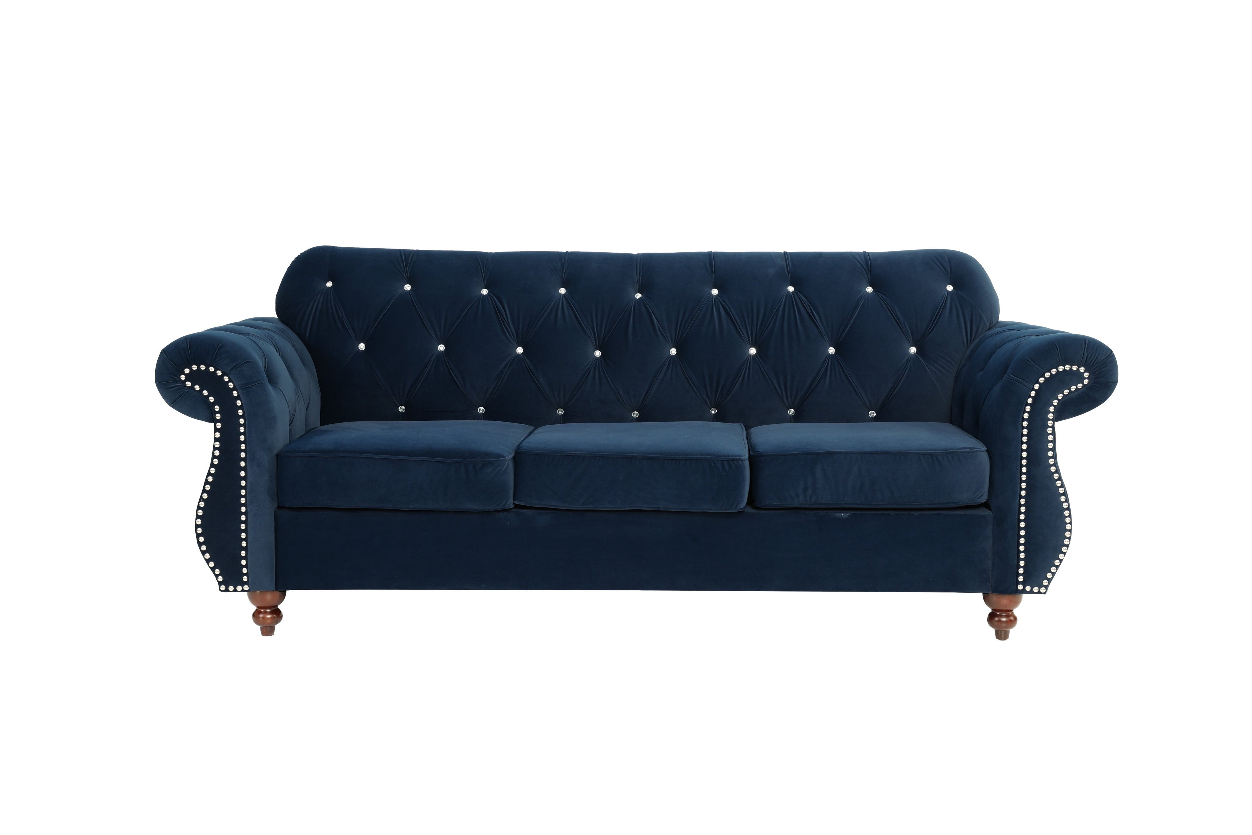 Elevate your living room with this formal, luxury-inspired indigo velvet sofa. Designed to combine classic silhouettes with modern detailing, it offers a sumptuous seating experience for entertaining guests or relaxing at home. The plush velvet upholstery, crystal tufting, and silver nailhead trim create a refined focal point that pairs beautifully with matching pieces (sold separately).