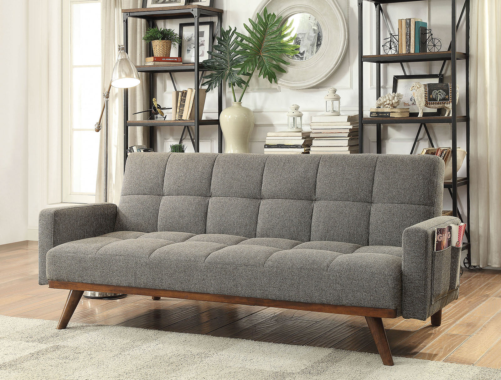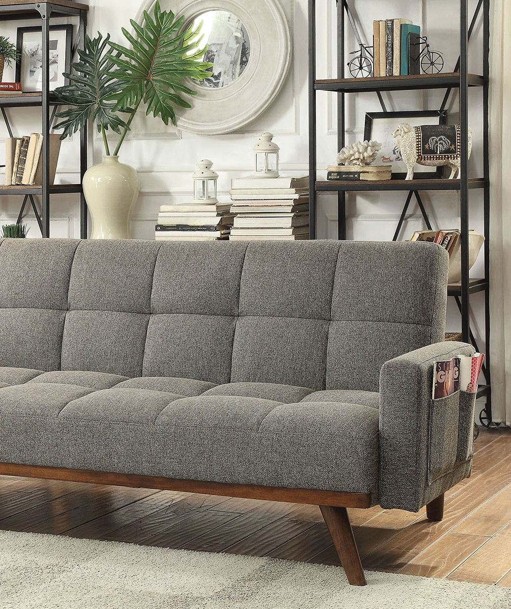 Transform any living area with this sleek mid-century modern futon that looks like a designer sofa but converts easily into a comfortable bed. Upholstered in gray tufted linen, it pairs clean lines and angled wooden legs for a contemporary yet cozy look. Built for versatility, it includes practical side pockets for remotes and small items, plus a sturdy frame and extra support legs for everyday use in a lounge, guest room, or studio apartment.