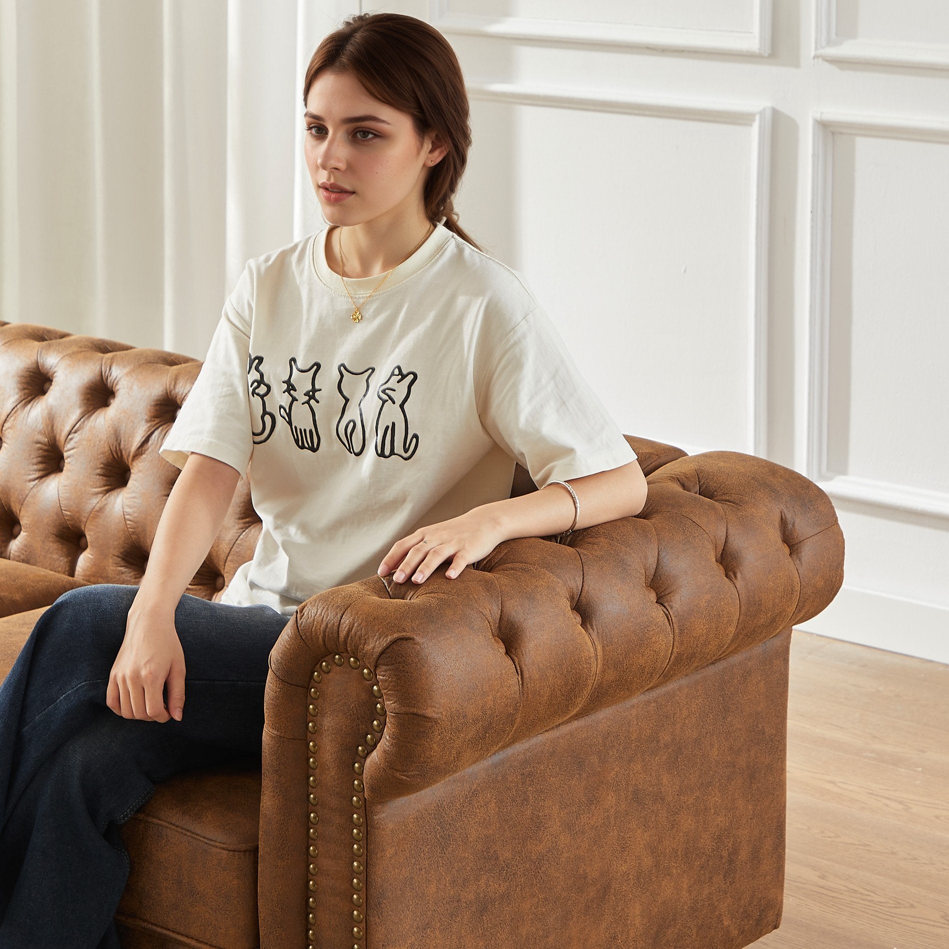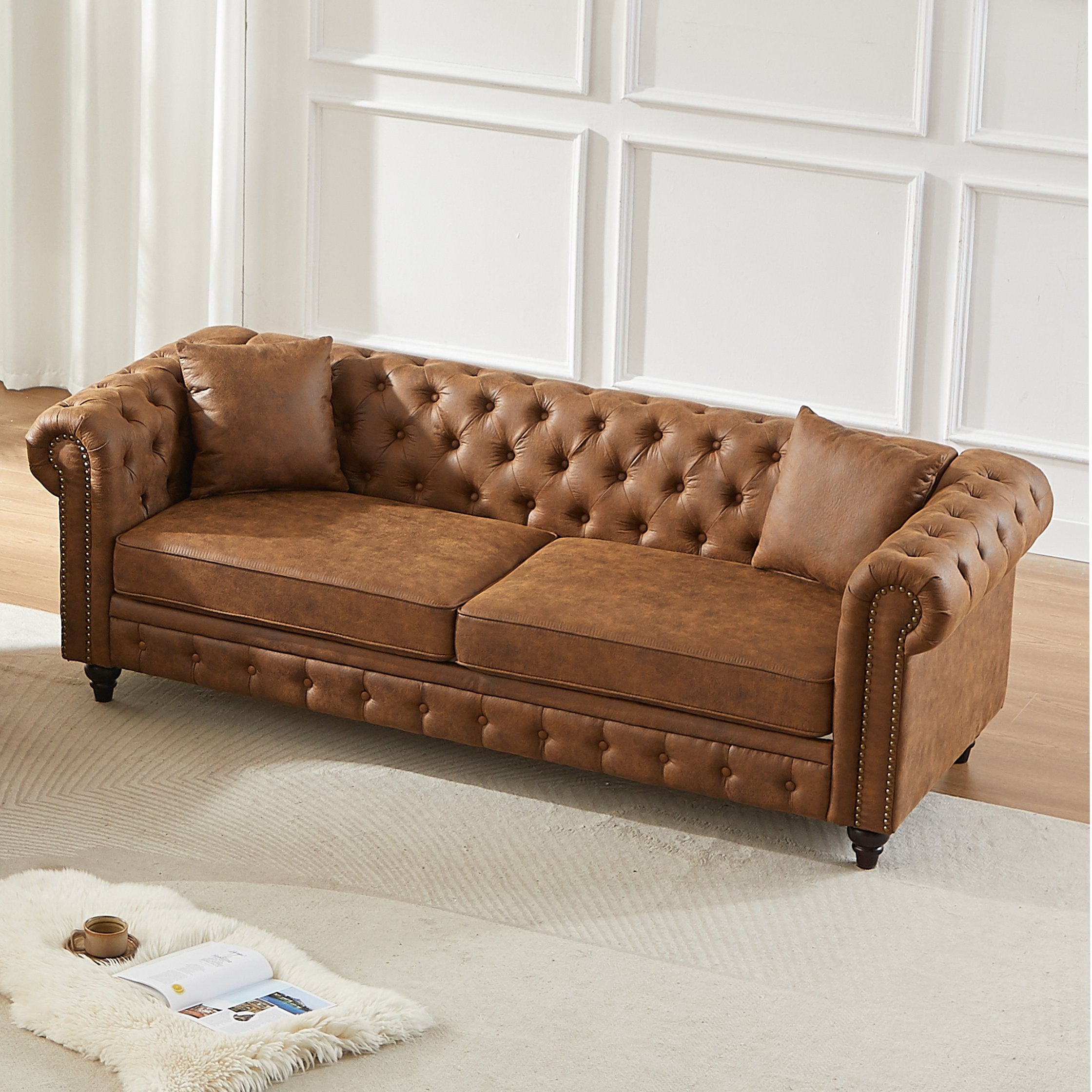 - CLASSIC STYLE: This luxurious sofa features the styling of a modern sofa with hand-tufted buttons, rolled arms, spacious three-person seating and brown wood legs in a classic Chesterfield design. This sofa has a timeless, sophisticated vintage flair that mirrors the décor of the living room, and living room.
