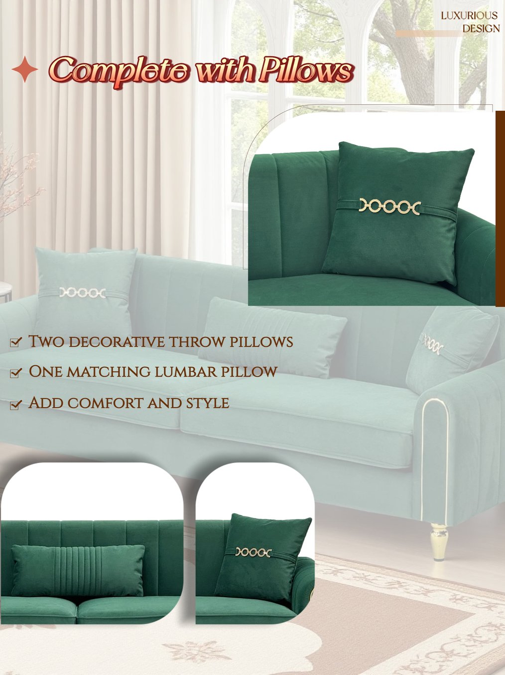 - Pillows Included: Two decorative throw pillows plus one lumbar pillow for added style and back support.