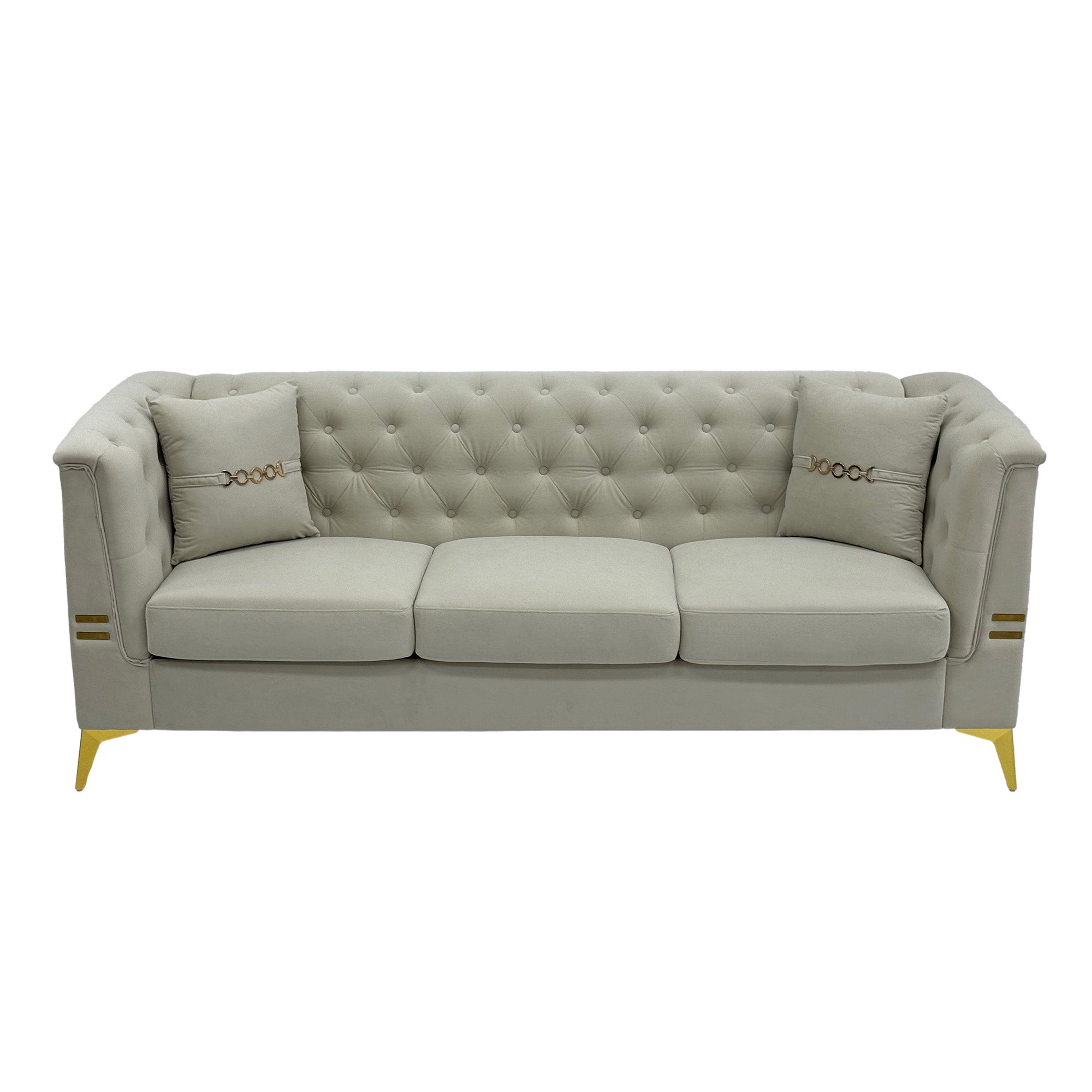 Refresh your living space with this elegant two-piece sofa set that blends modern lines with classic tufted detailing. Upholstered in soft cream-white velvet and supported by gold metal legs, the set offers both visual sophistication and everyday comfort—ideal for family rooms, apartments, lounges, or entertaining spaces.