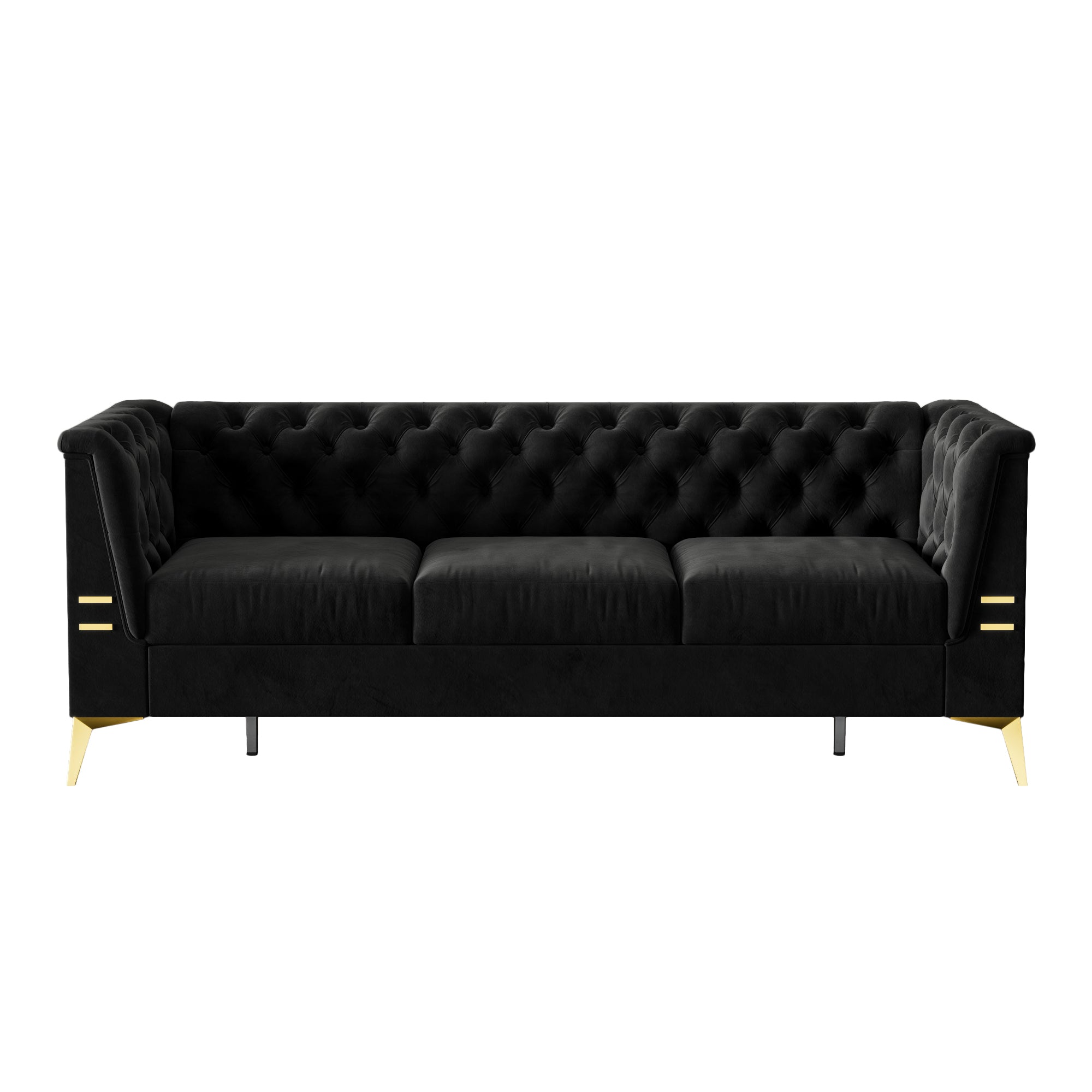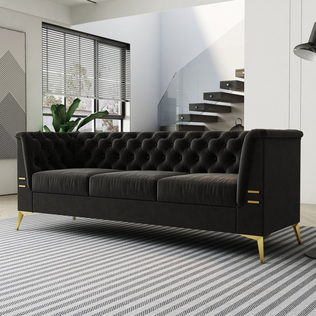 Elevate your living room or office with this luxurious black velvet Chesterfield-style sofa, combining classic tufted elegance with modern gold-accented legs. Plush upholstery and thoughtful construction deliver a soft, supportive seating experience while contemporary details—rolled arms, stainless-steel arm accents, and high metallic legs—make cleaning and styling effortless. This 3-seat sofa is ideal for formal lounges, reception areas, or upscale home interiors seeking a blend of comfort and visual impact.